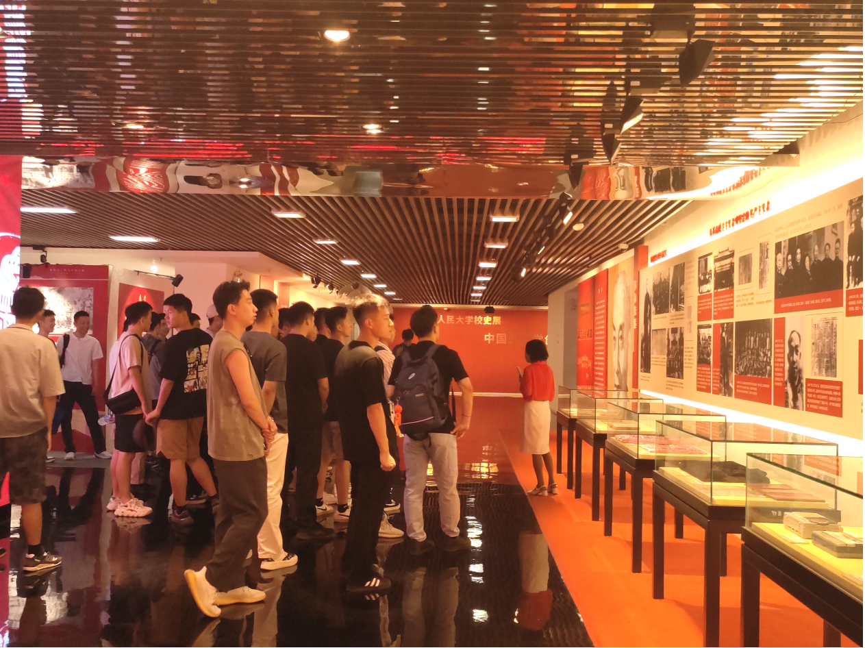 在张老师讲到毛主席所著的《矛盾论》、《实践论》等著作真迹正在展出时,参访同志纷纷驻足于前,泛黄的书页沉淀了近百年厚重的历史,激励着每一位新时代党员同志将青春写在中国大地上;面对通州新校区实景沙盘所展现的智慧高校建设成果,各位同志深切感受到京津冀协同发展国家战略的重要意义。