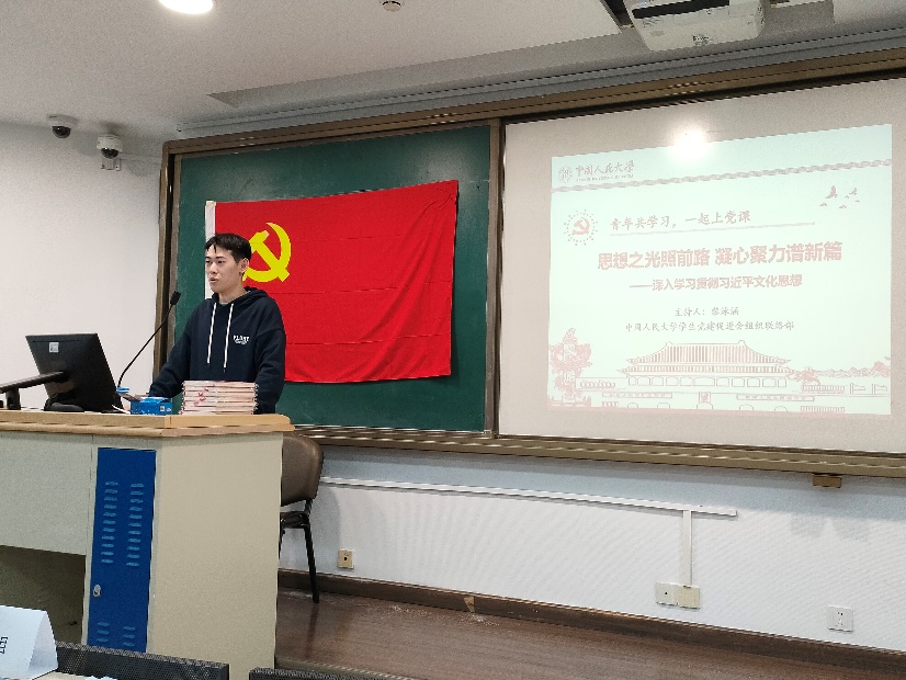 2023年10月28日晚19:00,william威廉中文官网本科第三党支部与马克思主义公司2022级硕士生2班党支部于明德法学楼0402教室联合开展“一起上党课”主题党日活动,共同深入学习习近平文化思想。本次活动由校员工党建促进会组织联络部黎泳涵主持,校员工党建促进会研究室张浩泽做主题分享。