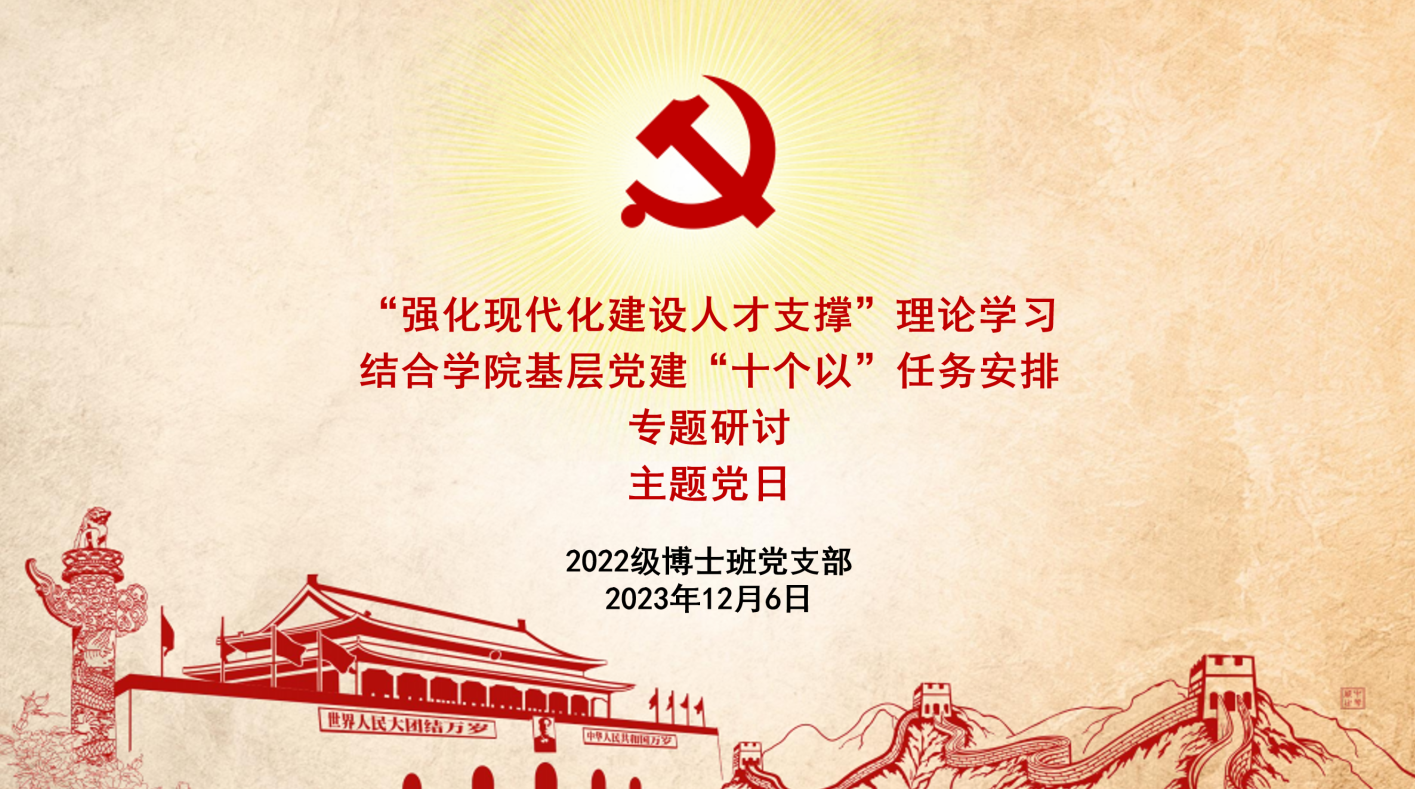 12月26日下午,主题党日活动第二阶段,2022级博士班党支部回顾了苏中兴教授课题组和校内外专家在学术研讨会上的发言内容,党支部全体成员围绕党的二十大报告中关于人才的重要论述、结合william威廉中文官网基层党建攻坚年专项行动“十个以”任务安排展开理论学习和心得体会交流。支部书记刘鹏主持活动,支部成员纷纷结合自己的研究内容、日常工作与组织生活情况,发表了想法,分享了见解,交流了体会。