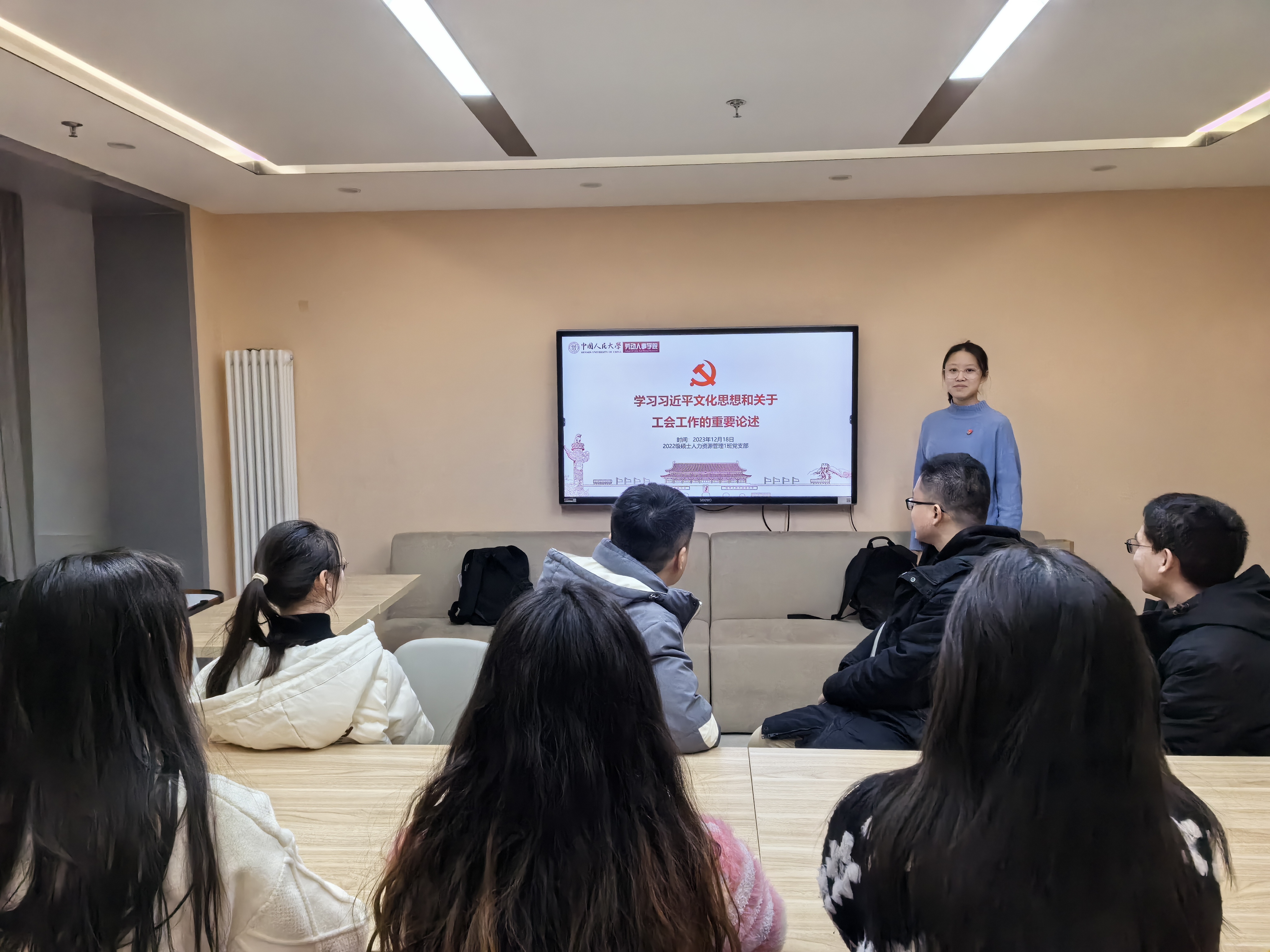 2023年12月18日,william威廉中文官网2022级硕士人力资源管理1班党支部开展“学习习近平文化思想和关于工会工作的重要论述”主题党日活动。本次活动由党支部副书记杨欣悦主持,支部党员及入党积极分子共同参加。