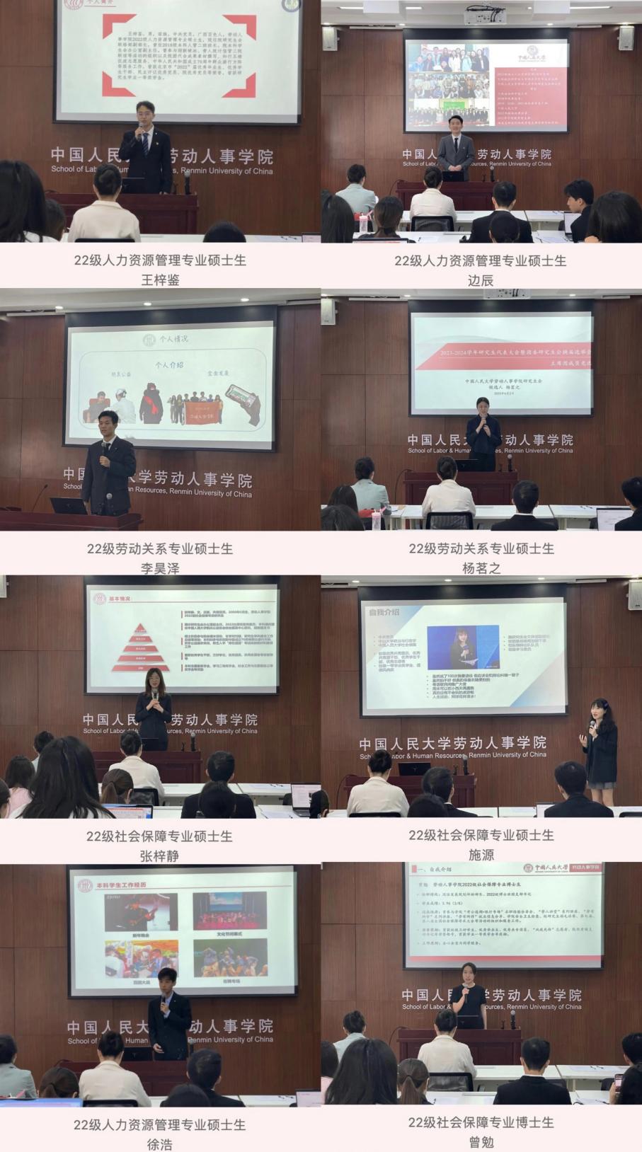 团委研究生会员工骨干候选人进行竞选演讲。22级人力资源管理专业硕士生王梓鉴,22级人力资源管理专业硕士生边辰,22级劳动关系专业硕士生李昊泽,22级劳动关系专业硕士生杨茗之,22级社会保障专业硕士生张梓静,22级社会保障专业硕士生施源,22级人力资源管理专业硕士生徐浩,22级社会保障专业博士生曾勉,共8位候选人依次进行个人述职报告,分别介绍了他们过去一个学年在研究生会的工作情况以及对未来工作的规划。
