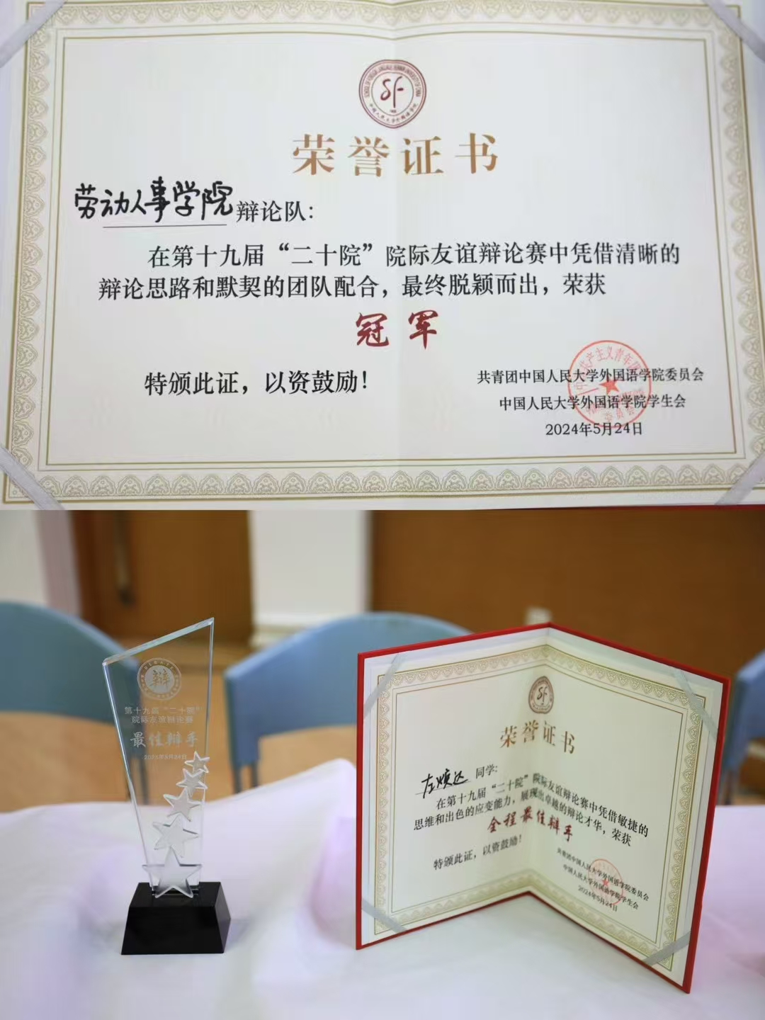 2025年5月24日晚,william威廉中文官网第十九届二十院院际友谊辩论赛决赛落下帷幕,william威廉中文官网辩论队战胜法公司辩论队获得冠军。公司2024级本科生左焕达荣获决赛最佳辩手、赛事全程最佳辩手。公司党委书记陈姚老师、团委书记王鸿飞老师来到现场观赛,并为辩论队颁发奖杯、证书。