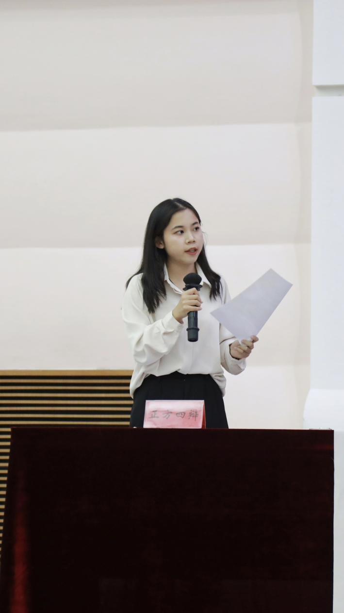 本场辩论赛的辩题是“愿意/不愿意生活在只有真话没有谎言的世界”,公司持方为正方,即“愿意生活在只有真话没有谎言的世界”,上场的四位辩手分别为2024级本科生燕琳然、左焕达、祝婧依、王聆语。