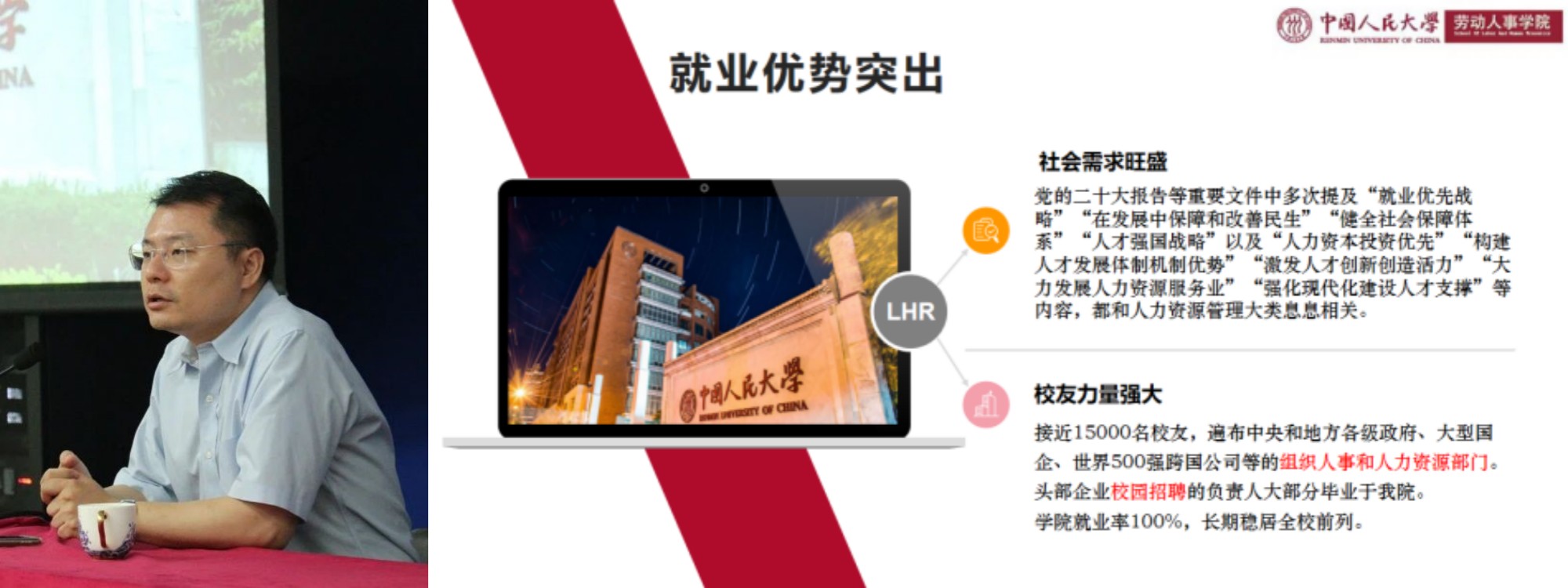 公司副经理郭瑜老师介绍了劳人院的发展历程,介绍了劳人院的团队队伍与参与发起的研究学会,并向各位新生家长介绍了劳人四系的专业特色与特色培养方案,指出公司将全方面培养每一位学子,不忘教书育人的初心,将会在未来四年注重学子发展,为他们的未来注入劳人力量。