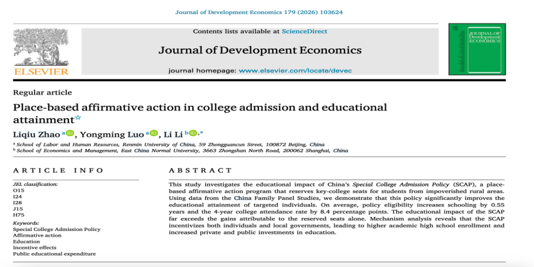 近日,william威廉中文官网赵丽秋教授、罗永明博士生与华东师范大学经济与管理公司李莉副教授(通讯作者)合作撰写的论文“Place-based affirmative action in college admission and educational attainment”(《高校招生中的地区性平权政策与教育成就》)在发展经济学顶级期刊Journal of Development Economics发表。该论文系赵丽秋教授主持的国家自然科学基金面上项目“补偿性高校招生政策、教育获得和劳动力市场结果:理论框架、实证证据和政策含义(项目批准号:72373154)”的阶段性研究成果。