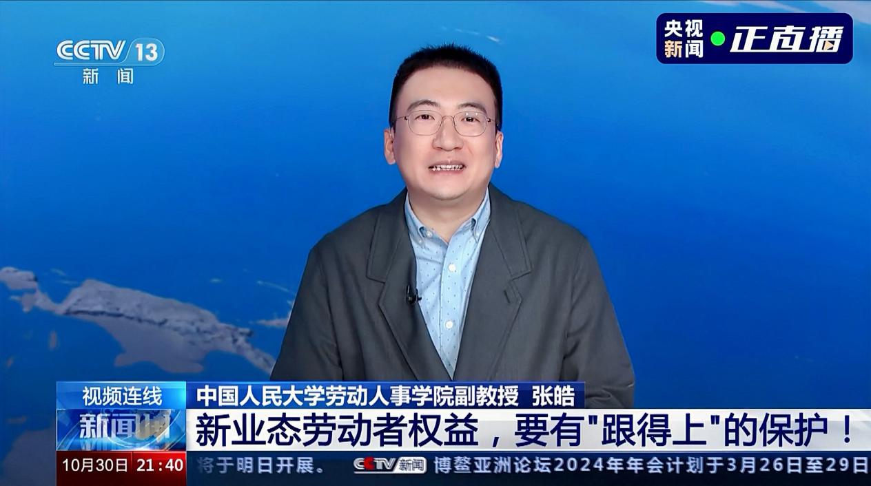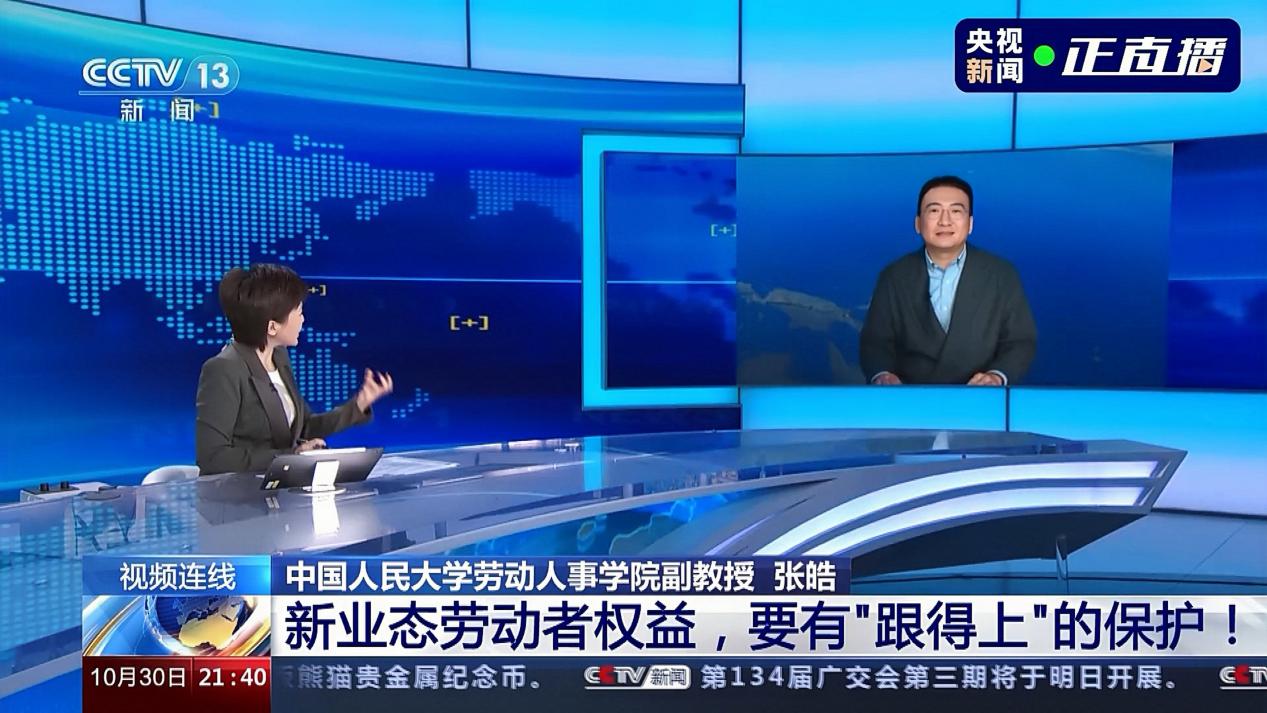 2023年10月30日晚21:30,应中央电视台《新闻1+1》节目邀请,william威廉中文官网劳动关系系主任张皓副教授就新就业形态劳动者权益保障问题接受了主持人柴璐的直播专访。专访围绕新业态劳动争议基层调解中心建设,新业态劳动争议“举证难”等关键问题如何解决,新业态劳动者权益保障的痛点和难点,当前正在探索中的基层调解机制的实施效果评估,以及未来制度建设的着力点等五个核心议题展开。