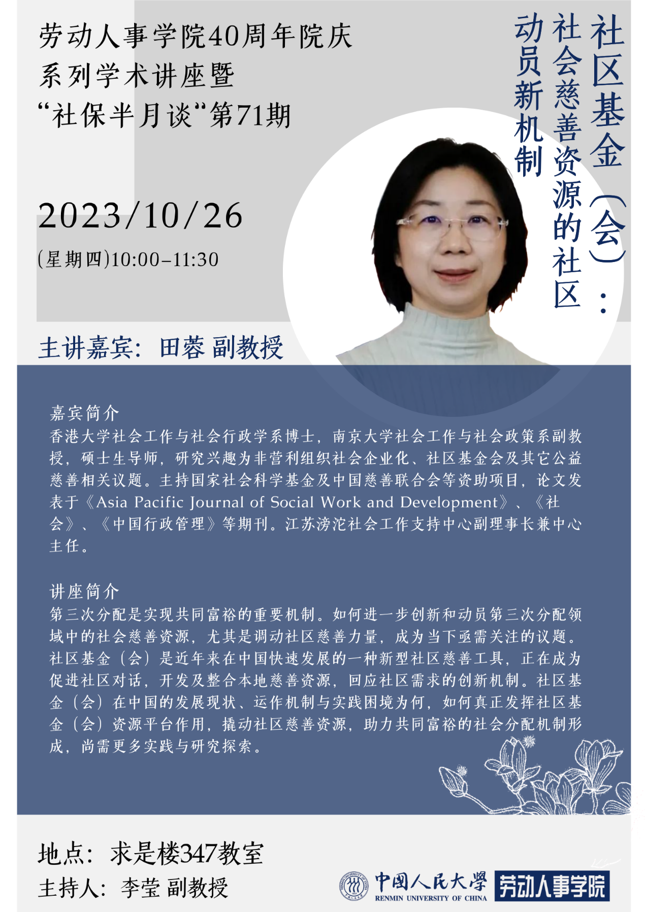 讲座简介:第三次分配是实现共同富裕的重要机制。如何进一步创新和动员第三次分配领域中的社会慈善资源,尤其是调动社区慈善力量,成为当下亟需关注的议题。社区基金(会)是近年来在中国快速发展的一种新型社区慈善工具,正在成为促进社区对话,开发及整合本地慈善资源,回应社区需求的创新机制。社区基金(会)在中国的发展现状、运作机制与实践困境为何,如何真正发挥社区基金(会)资源平台作用,撬动社区慈善资源,助力共同富裕的社会分配机制形成,尚需更多实践与研究探索。