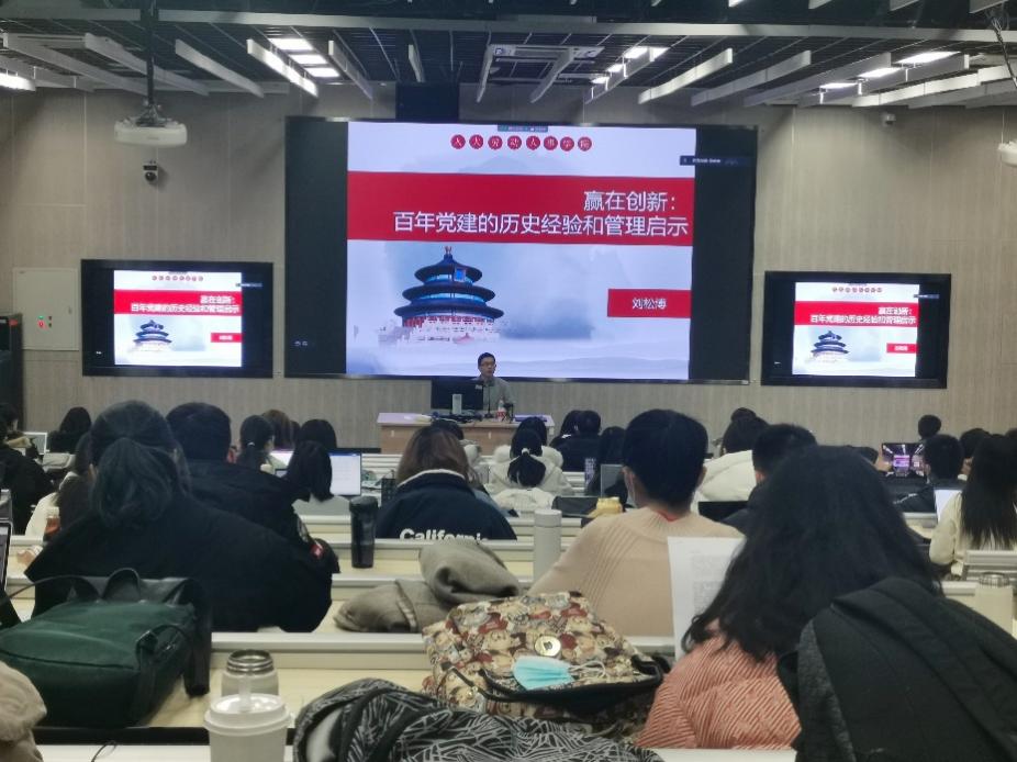 12月1日下午,公司党委委员刘松博教授在公教一楼1102教室为全体学员讲授题为“赢在创新:百年党建的历史经验和管理启示”的专题党课。刘松博由“蒋廷黻之问”开场,分析了中国共产党在革命斗争中取得胜利的原因,进而介绍了我们党自成立以来重视党的建设所进行的重要创新和所取得的重大成就,号召学员们认真学习党史,增强“四个意识”,坚定“四个自信”,做到“两个维护”。