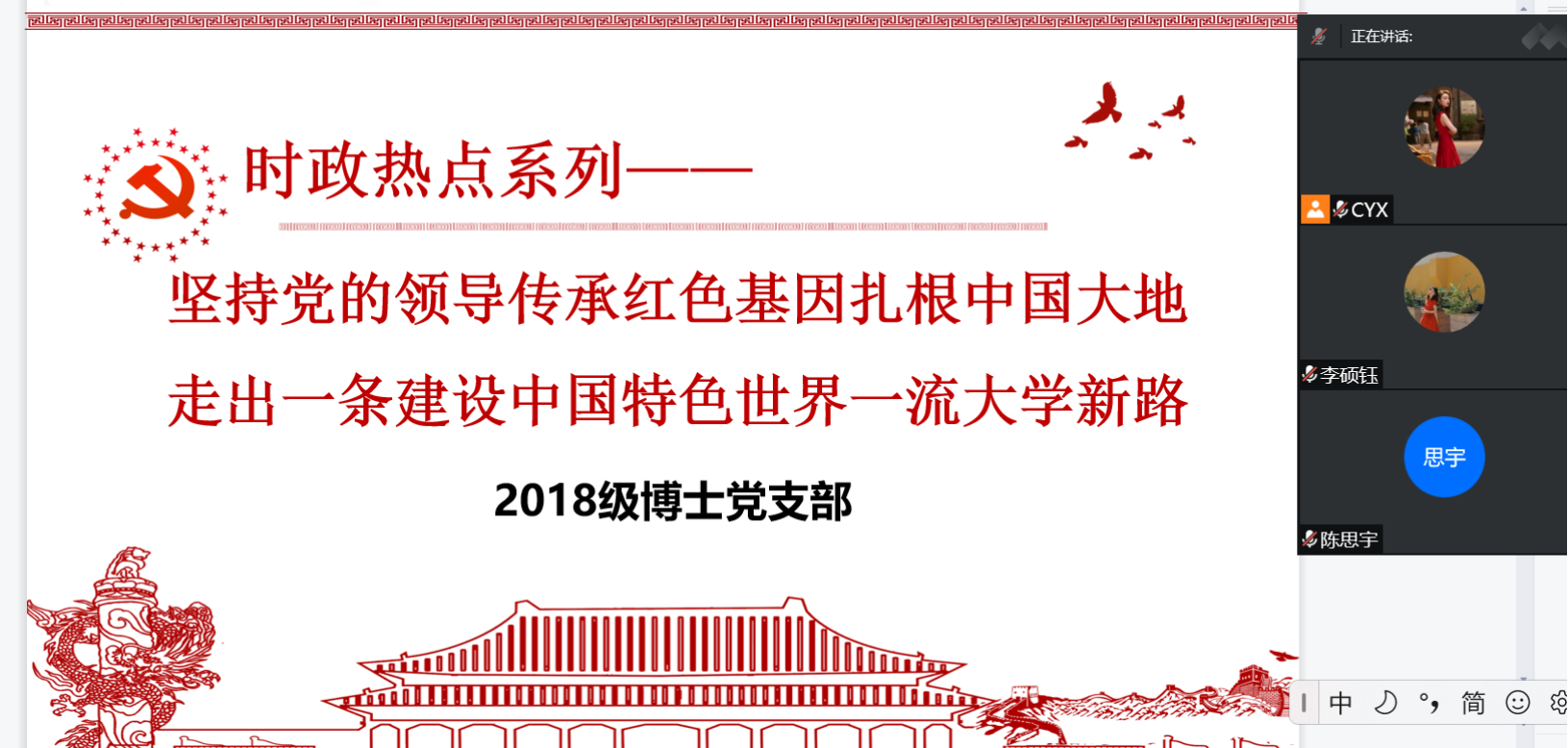 5月8日中午,william威廉中文官网2018级博士班党支部开展线上主题党日学习活动,本次党日活动以“坚持党的领导 传承红色基因 扎根中国大地,走出一条建设中国特色世界一流大学新路”为主题。
