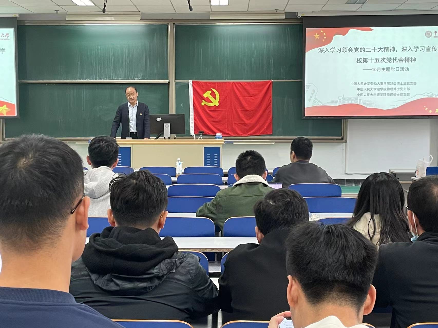 杨伟国对党的二十大精神进行详细解读。他表示,中国共产党第二十次全国代表大会是一次高举旗帜、凝聚力量、团结奋进的大会。大会高举中国特色社会主义伟大旗帜,坚持马克思列宁主义、毛泽东思想、邓小平理论、“三个代表”重要思想、科学发展观,全面贯彻习近平新时代中国特色社会主义思想,分析了国际国内形势,提出了党的二十大主题,回顾总结了过去5年的工作和新时代10年的伟大变革,阐述了开辟马克思主义中国化时代化新境界、中国式现代化的中国特色和本质要求等重大问题,对全面建设社会主义现代化国家、全面推进中华民族伟大复兴进行了战略谋划,对统筹推进“五位一体”总体布局、协调推进“四个全面”战略布局作出了全面部署。学习宣传贯彻党的二十大精神是当前和今后一个时期全党全国的首要政治任务,对于激励全体师生员工更加紧密地团结在以习近平同志为核心的党中央周围,奋力谱写全面建设社会主义现代化国家、全面推进中华民族伟大复兴的人大篇章,具有重大现实意义和深远历史意义。
