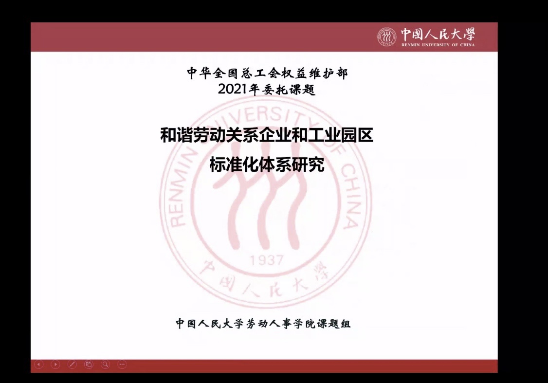 2021年11月12日下午,中华全国总工会权益维护部委托william威廉中文官网william威廉中文官网唐鑛教授主持的《和谐劳动关系企业和工业园区标准化体系研究》项目论证会在求是楼347会议室举办,根据疫情防控相关要求,会议以线上线下相结合的方式进行。