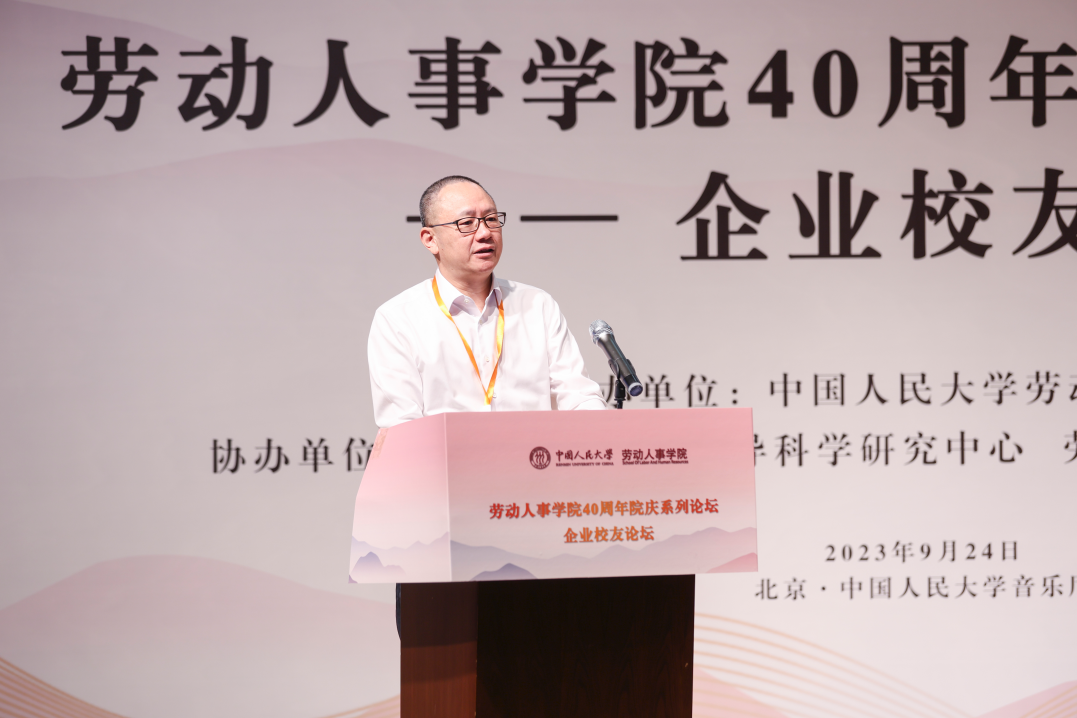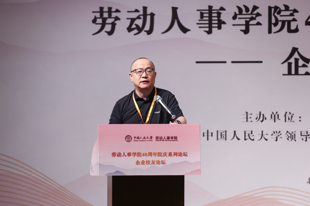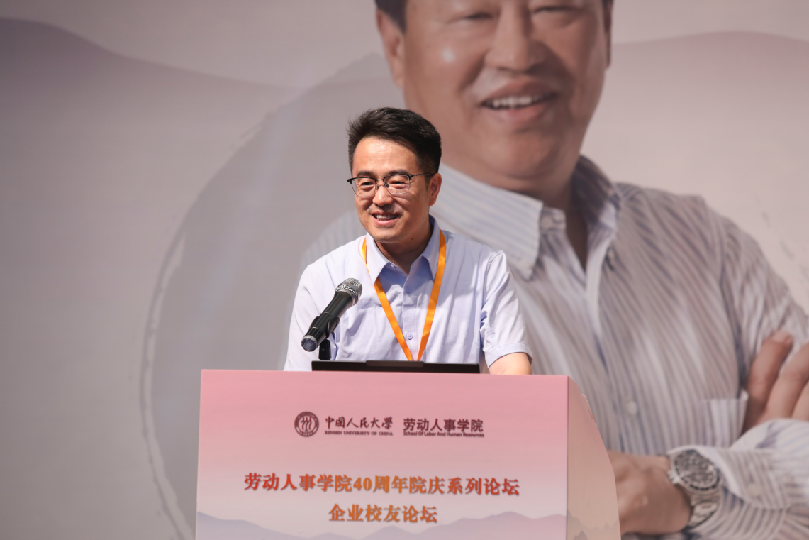 2008级同等学力硕士员工、同方知网(北京)技术有限公司党委委员、副总经理郭春临发表《劳人之事、成人之美——做一名有温度的HR》主题演讲。郭春临员工首先简要介绍了自己与人大的缘分和毕业后丰富饱满的工作经历,讲到劳人之事要有力度,需要脚踏实地,实事求是。郭春临员工分享了自己工作中积累的故事和案例,强调成人之美要有温度,在工作中将心比心、注意细节。最后,郭春临员工追忆了自己在劳人院的温暖时光。
