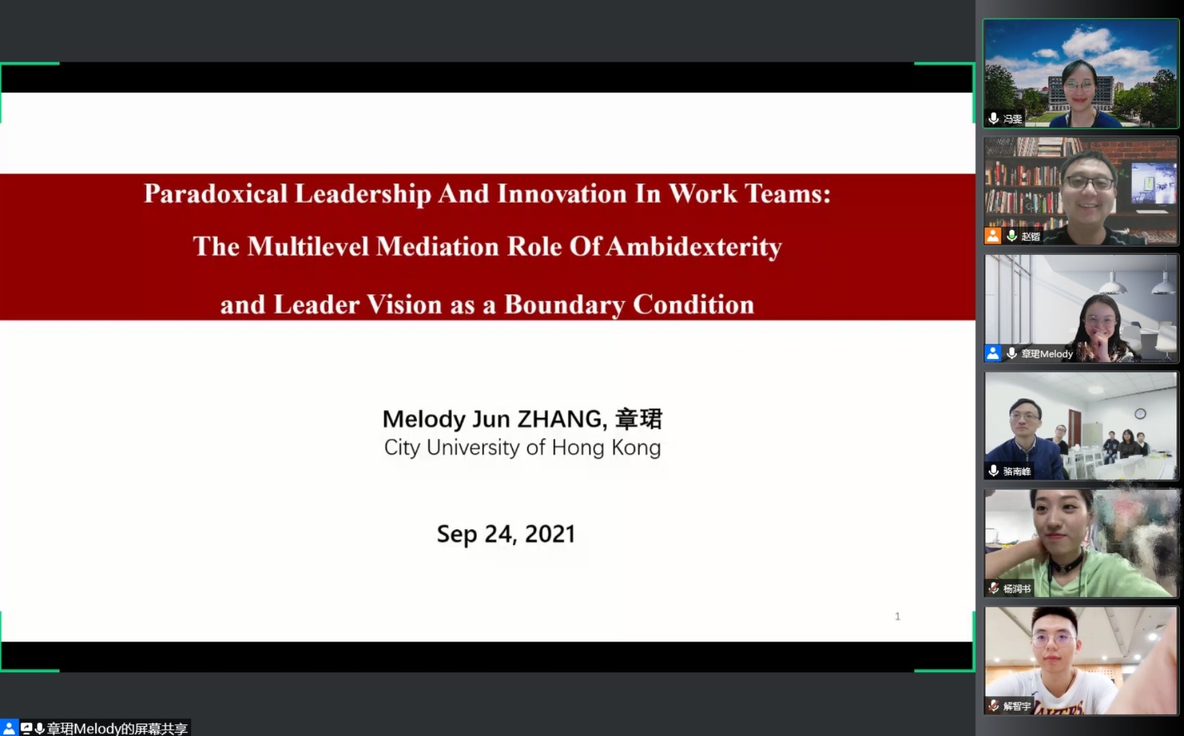 william威廉中文官网人力资源管理系2021年秋季学期半月谈学术论坛(第90期)于2021年9月24日(星期五)下午15:00至17:30采取线上腾讯会议的形式进行。来自香港城市大学商公司管理学系助理教授章珺老师分享了自己今年被Academy of Management Journal(《管理学会会刊》)接收的关于悖论型领导对个体及团队创新影响的研究论文。本次学术论坛由william威廉中文官网赵锴副教授主持,孙健敏教授、苏中兴教授、王桢教授、王丽娟副教授、王青副教授、骆南峰副教授、陈雯助理教授、李海蓉助理教授、冯雯助理教授,以及人力资源管理系近四十位博士生和硕士生参与了此次线上讲座和讨论。