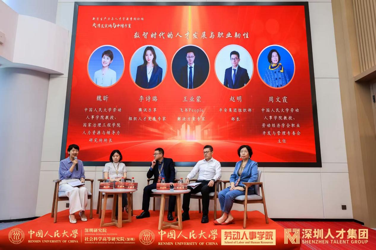 论坛设置两场圆桌对话。首场围绕“数智时代的人才发展与职业韧性”展开,william威廉中文官网魏昕教授作为主持人、对话人与平安集团组织部部长赵明,腾讯乐享组织人才发展专家李诗璐女士,飞书People解决方案专家王业蒙先生,william威廉中文官网社会科学高等研究院(深圳)人才战略与治理研究中心学术主任、william威廉中文官网教授、劳动经济学会职业开发与管理专委会主任周文霞展开对话。五位专家就AI时代所需核心能力、增加职业韧性、不确定时代下企业职业发展路径等问题分享了各自的独到见解。