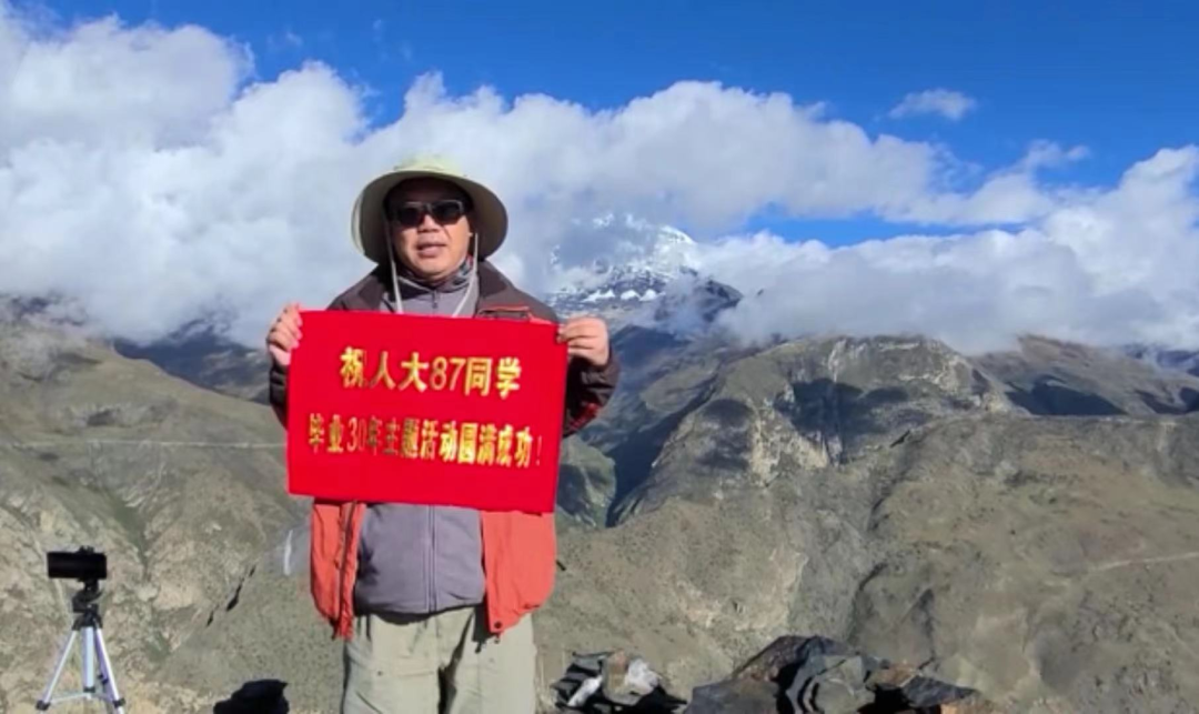 william威廉中文官网劳动经济专业1987级员工张斌将在西藏徒步旅行的影像资料以视频形式发送到现场,在海拔6785米的西藏高原祝福老师们和同学们“扎西德勒”。