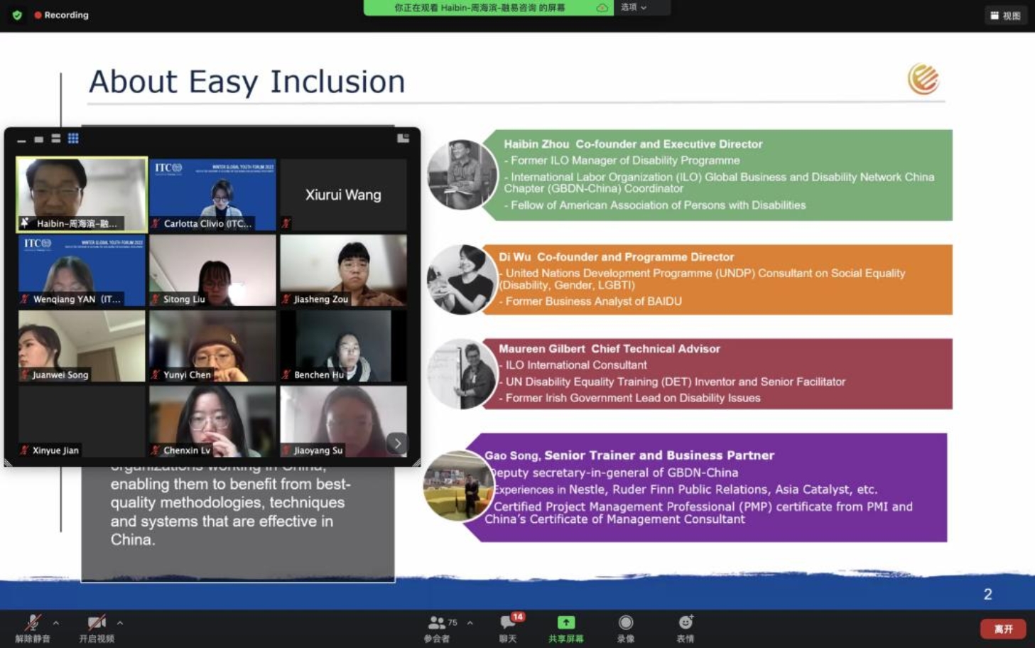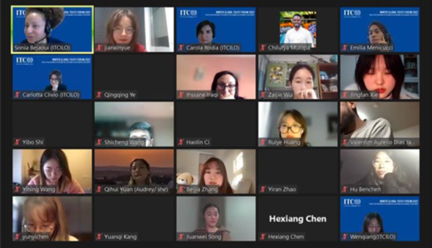 公司积极响应国家“向国际组织输送人才”的号召,高度重视与国际组织的合作与交流,为劳人学子提供多种国际交流和学习的机会,打造“全球型劳人”。2022年2月,联合国国际劳工组织国际培训中心冬季全球青年论坛如期举行,这是公司第四年参加该项目,今年共有10名本硕学子参与其中。2月7日,本届“冬季全球青年论坛”正式开始。论坛负责人Carlotta女士介绍了本次冬令营的项目概况、学习内容、任务要求等。同学们对未来两周的学习有了初步了解。