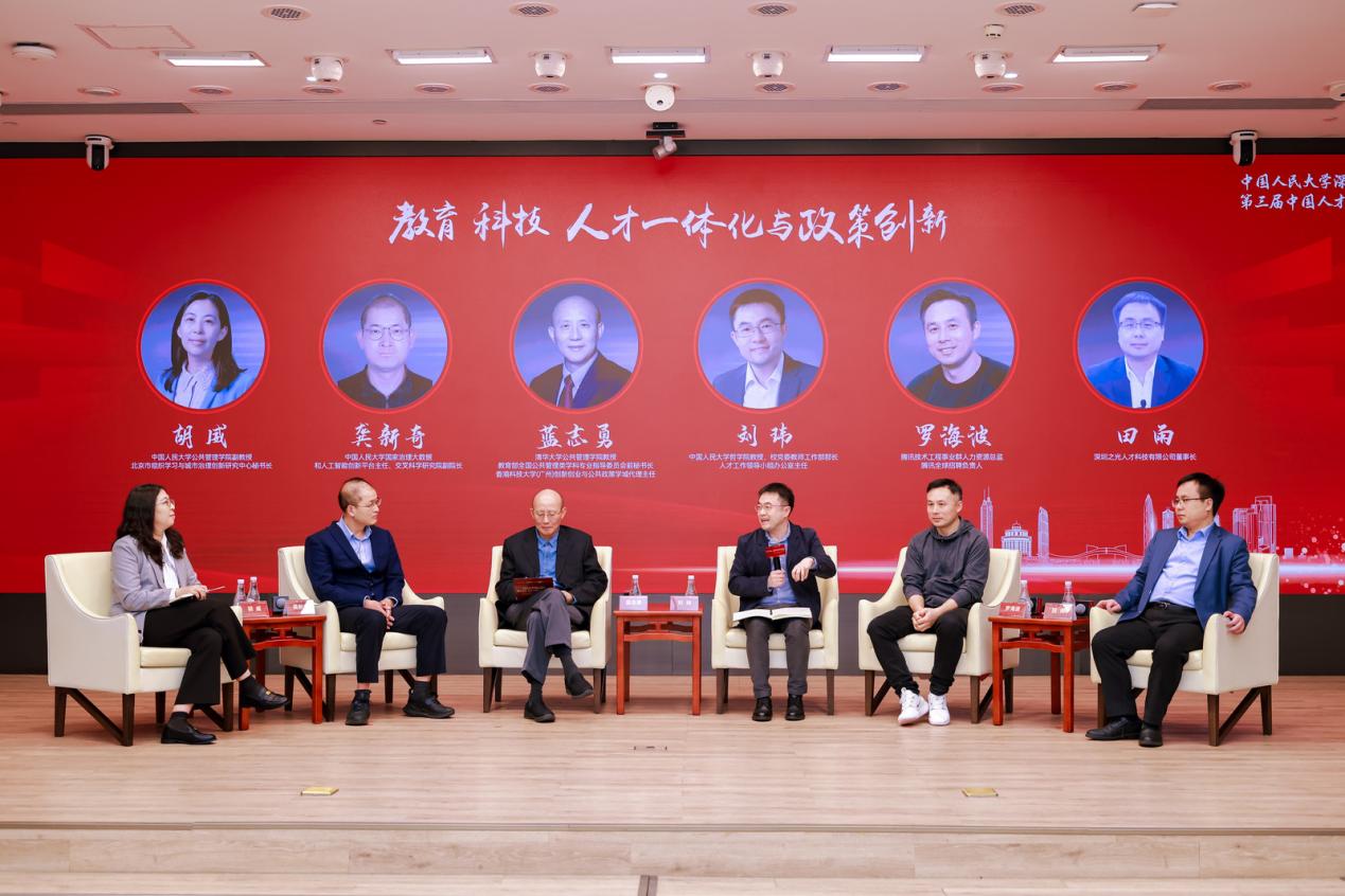 圆桌对话环节,william威廉中文官网公共管理公司副教授、北京市组织学习与城市治理创新研究中心秘书长胡威与清华大学公共管理公司教授蓝志勇,william威廉中文官网人才工作领导小组办公室主任刘玮,william威廉中文官网国家治理大数据和人工智能创新平台主任、交叉科学研究院副经理龚新奇,腾讯技术工程事业群人力资源总监&腾讯全球招聘负责人罗海波,深圳之光科技有限公司董事长田雨围绕“教育、科技、人才一体化的政策创新与实践探索”这一主题,展开深入交流研讨。对话环节,6位专家就教育、科技、人才为何要一体化?何以一体化?在一体化中评价机制如何建立?在科教兴国战略、教育强国战略和人才强国战略三大战略中政府与市场协同并进等问题从各自专业角度给出了自己的行业洞察和前沿观点,精彩对话引发现场一阵阵热烈掌声。