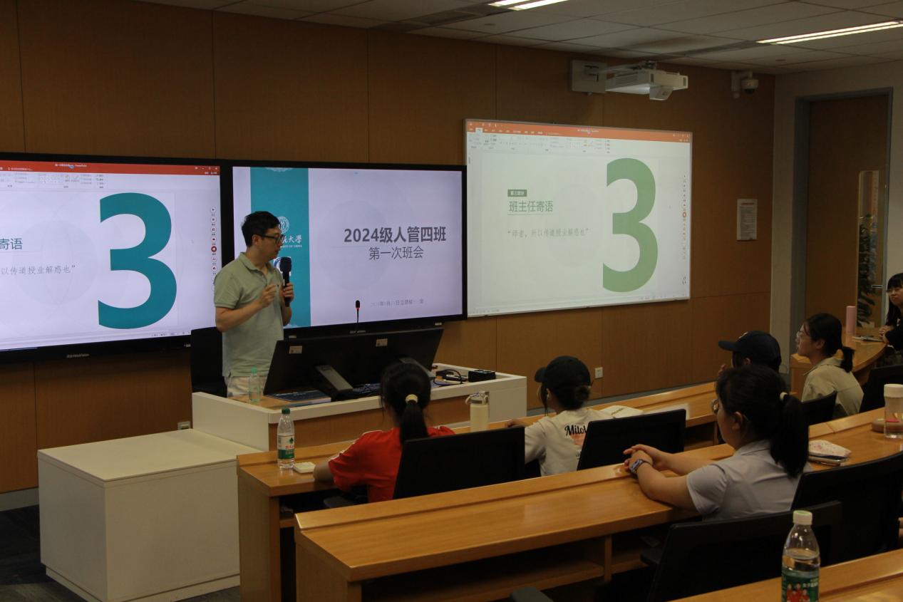 初逢同窗谊,共绘未来景。在第一次班会上,各班首先采取了各具特色的游戏方式,让大家迅速破冰,增进彼此了解。此外,各班班主任与辅导员向大家抛出了一个核心问题:“大学到底该如何度过?”班主任老师们指出,老员工活要在不断尝试中探索适合自己的道路,并在这条道路上沉潜升腾,最终完成自我价值实现。