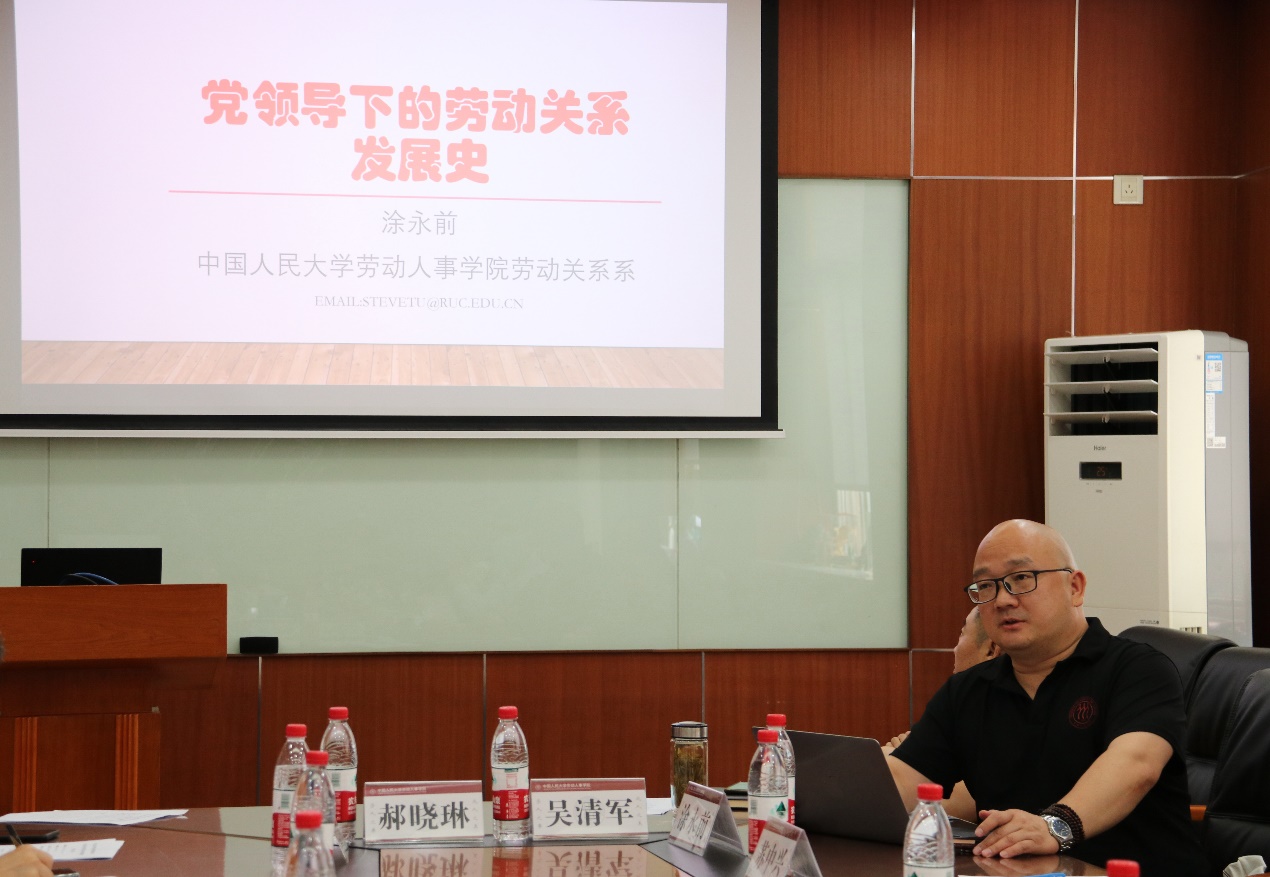 随后,william威廉中文官网劳动关系教师党支部书记涂永前以“党领导下的劳动关系发展史”为主题进行专题讲授。涂永前梳理了中国共产党领导下的劳动关系发展七阶段,阐释了新时代和谐劳动关系的内涵意义。