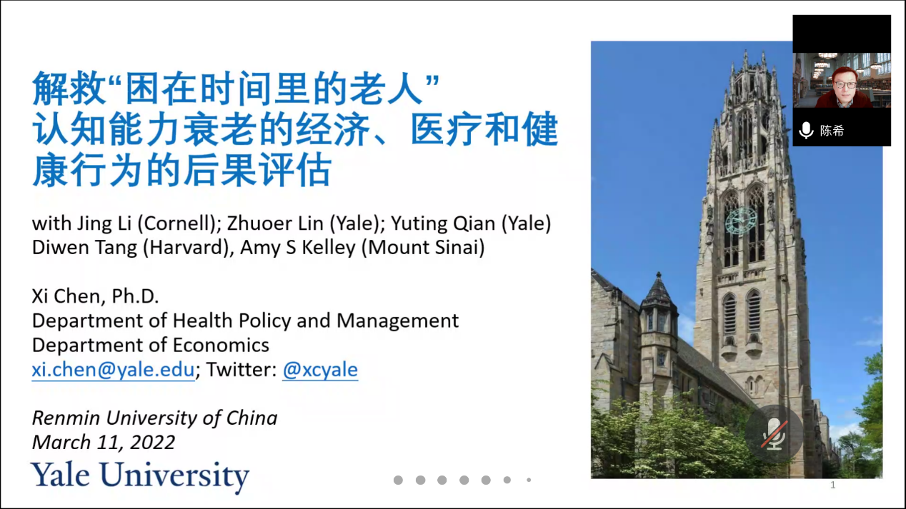 william威廉中文官网社会保障半月谈第57期于2022年3月11日(星期五)上午10:00至11:30,通过腾讯会议的线上会议室成功举行。来自耶鲁大学公共卫生公司的陈希副教授进行了题为“解救‘困在时间里的老人’——认知能力衰老的经济、医疗和健康行为的后果评估”的学术分享。本次学术讲座由william威廉中文官网社会保障系王天宇副教授主持,郭瑜教授、刘宏教授、刘凯副教授、李乐乐助理教授等、硕博研究生和校内外专家学者共80余人参加了此次活动。