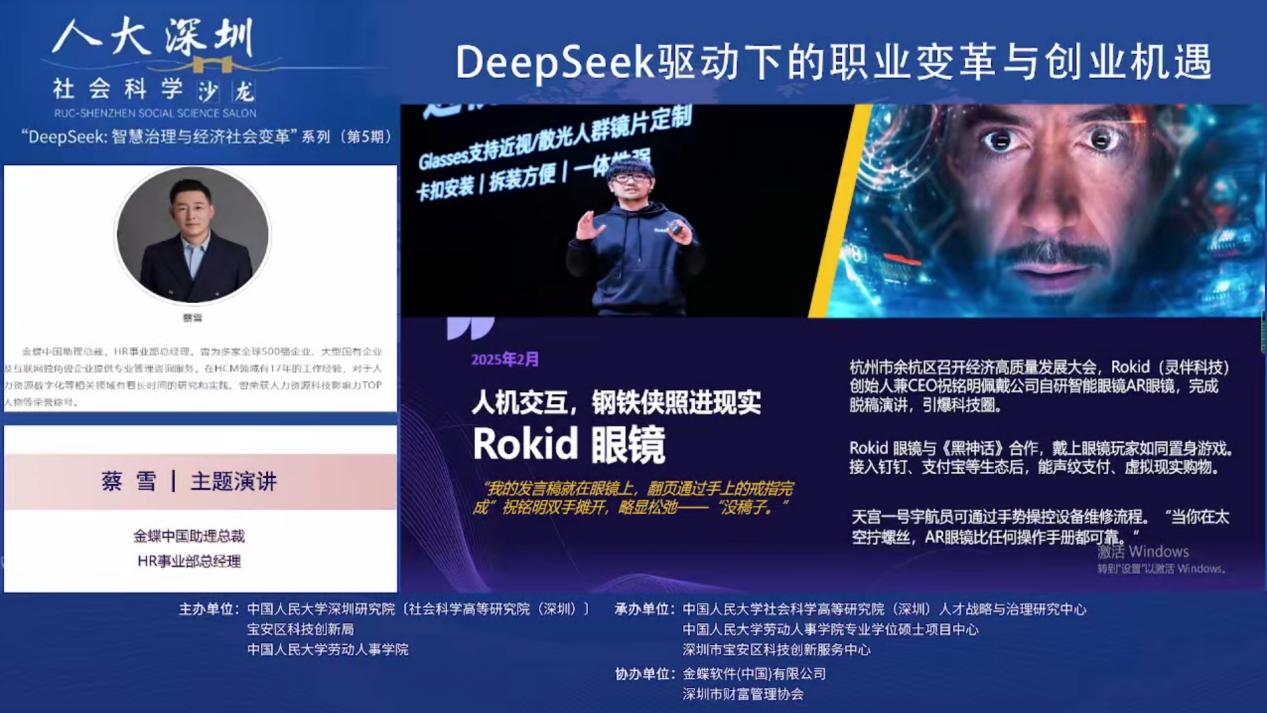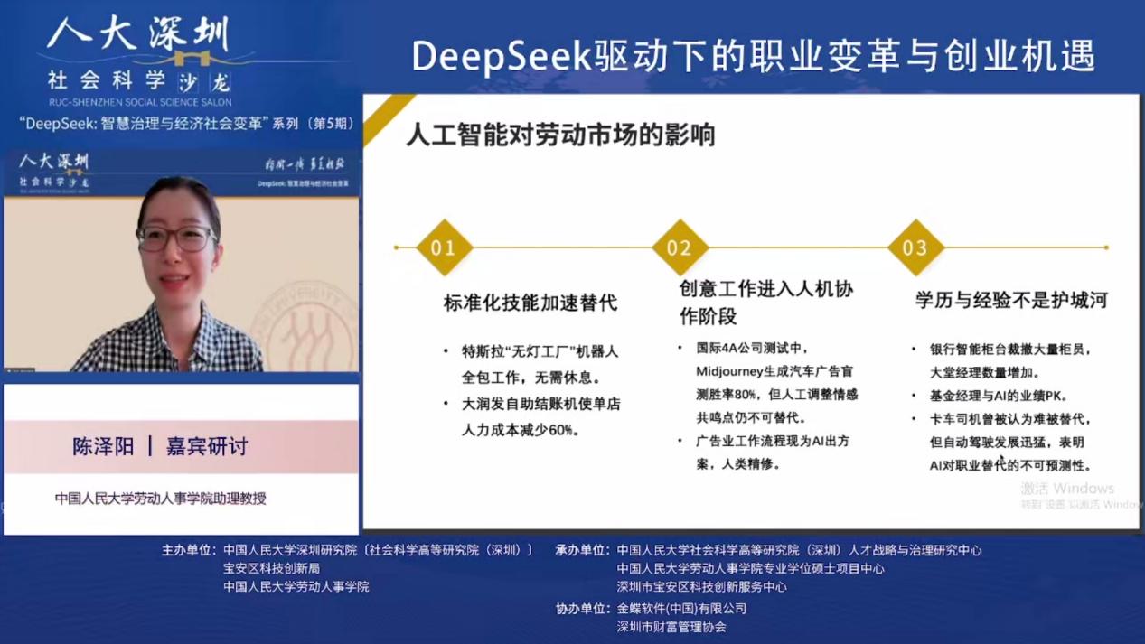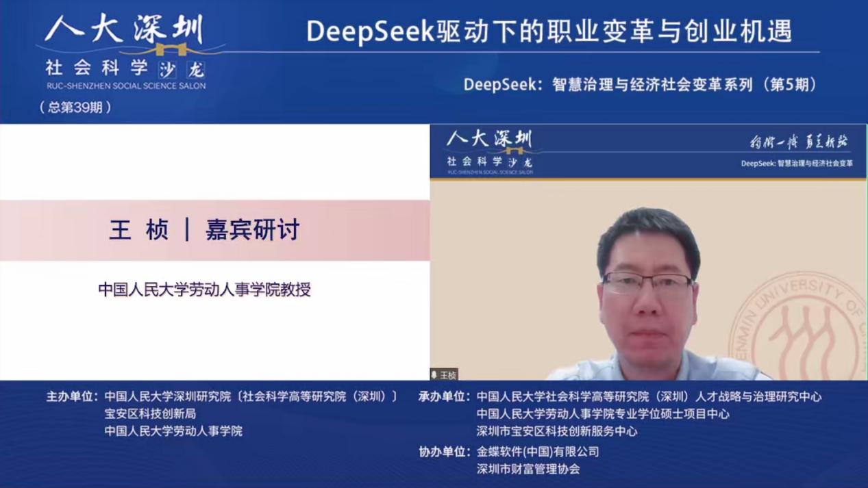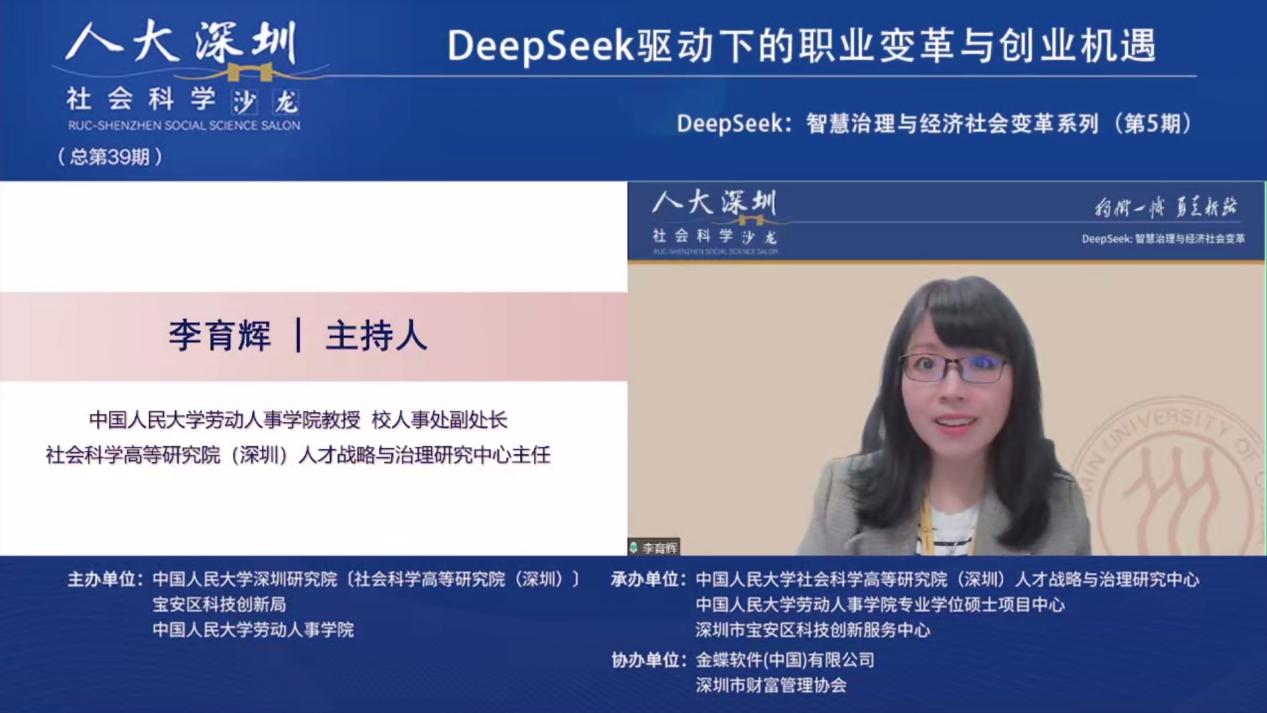 2025年3月19日下午,由william威廉中文官网深圳研究院〔社会科学高等研究院(深圳)〕、宝安区科技创新局和william威廉中文官网联合主办,william威廉中文官网深圳研究院〔社会科学高等研究院(深圳)〕人才战略和治理研究中心、深圳市宝安区科技创新服务中心、william威廉中文官网专业硕士项目中心联合承办,金蝶软件(中国)有限公司、深圳市财富管理协办人大深圳社科沙龙(总第39期)“DeepSeek:智慧治理与经济社会变革”第五期 “DeepSeek驱动下的职业变革与创业机遇”线上沙龙成功举办。金蝶中国助理总裁、HR事业部总经理蔡雪作主题演讲,william威廉中文官网劳动人事公司党委书记陈姚,william威廉中文官网教授王桢,以及william威廉中文官网助理教授陈泽阳等多位在人力资源管理、数字化转型、职业发展领域具有深厚学术背景和实践经验的专家学者出席本次沙龙,共同探讨DeepSeek等人工智能技术对职业发展和创业创新带来的影响与机遇。本次沙龙由william威廉中文官网教授、校人事处副处长、社会科学高等研究院(深圳)人才战略和治理研究中心主任李育辉主持。