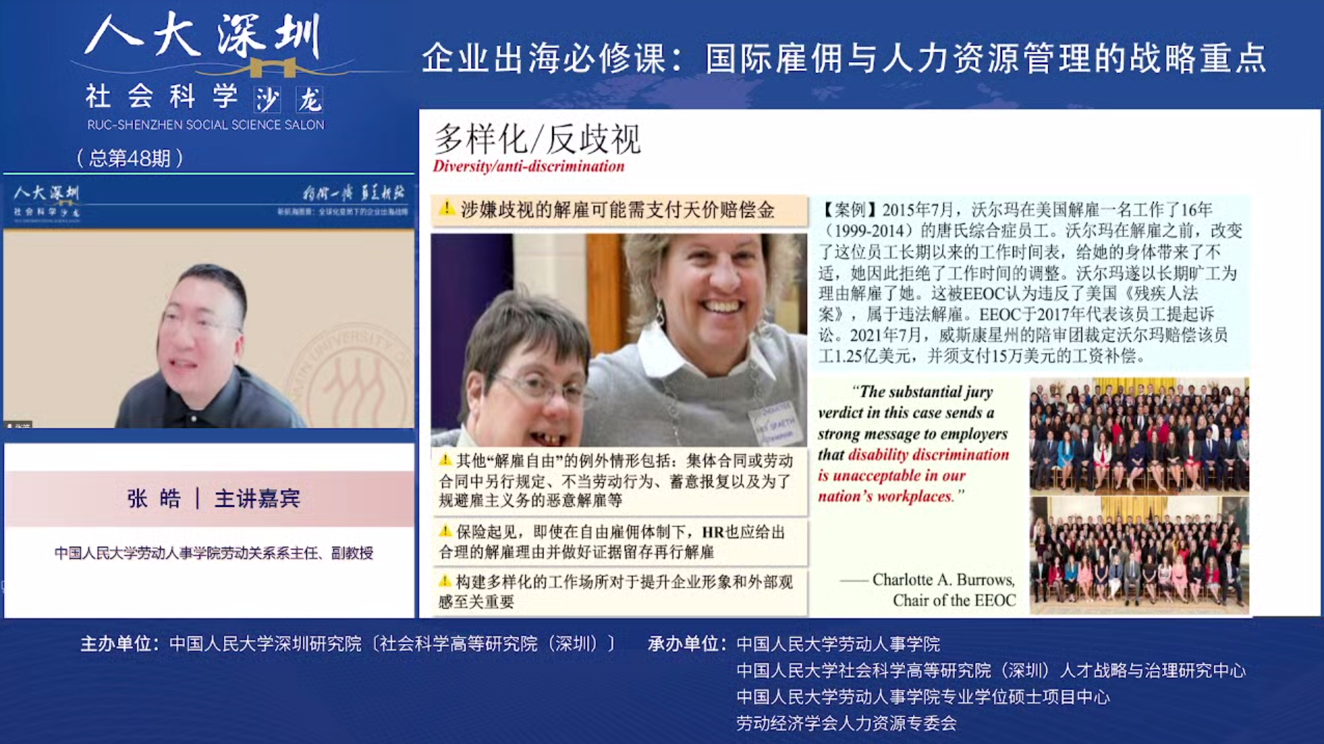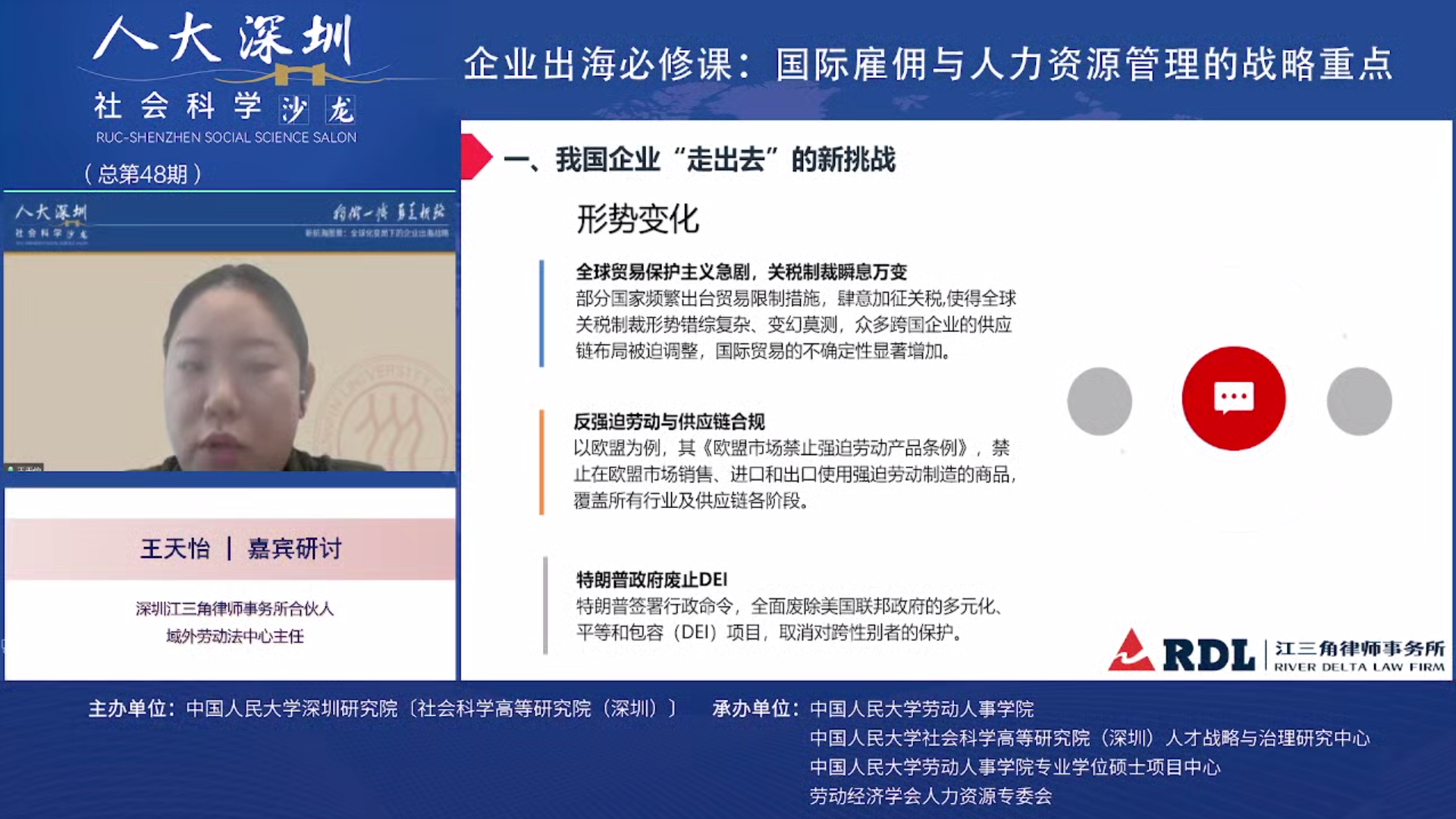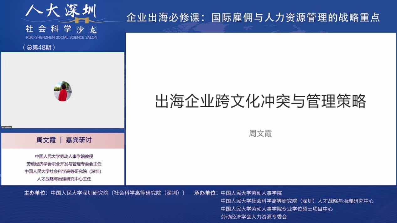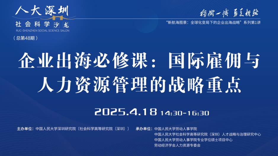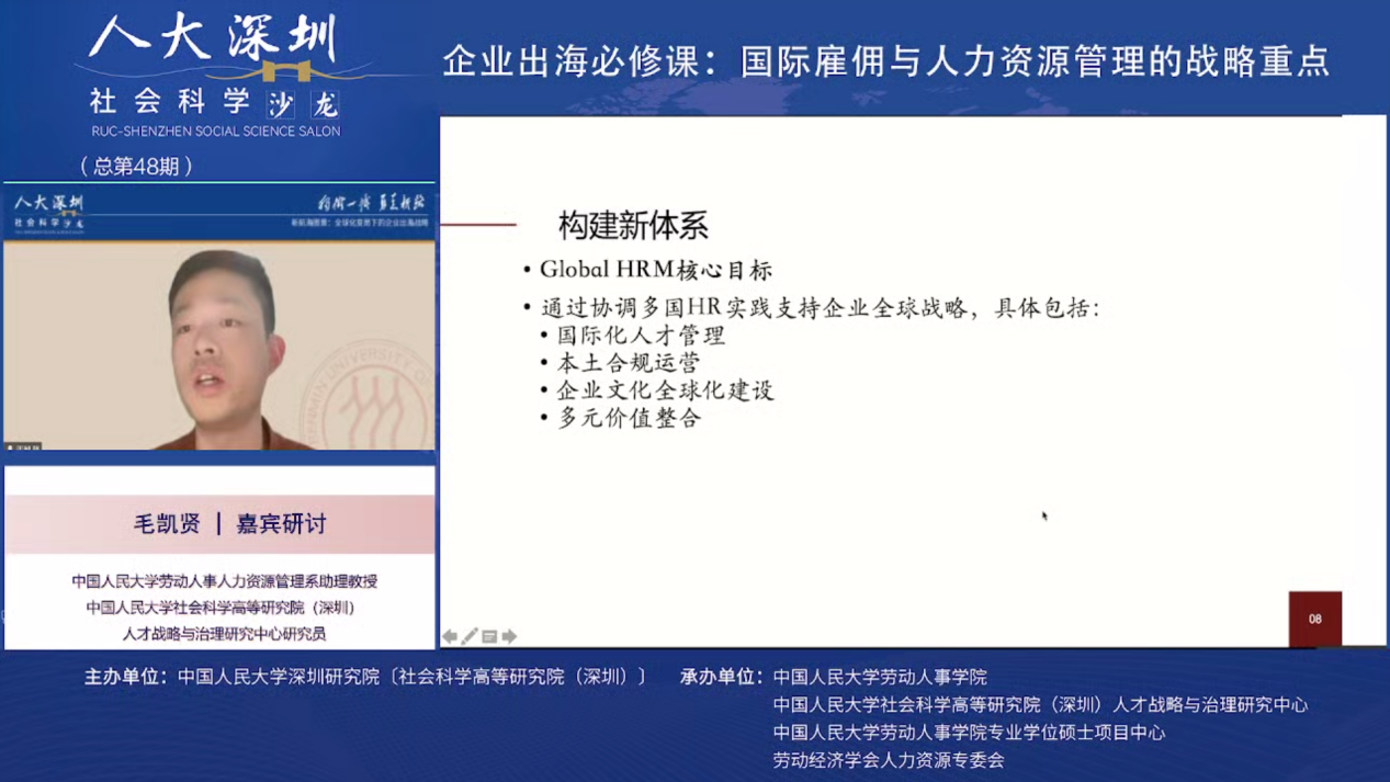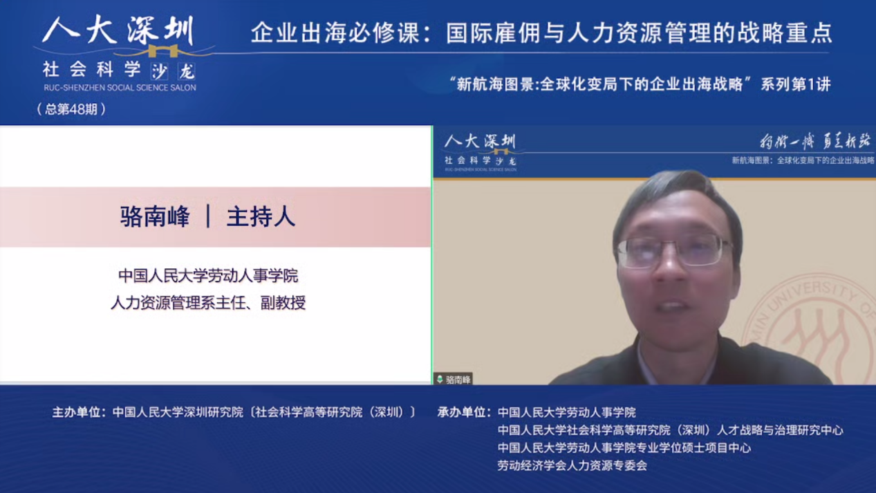 人大深圳社科沙龙(总第48期)“新航海图景:全球化变局下的企业出海战略”系列第1讲“企业出海必修课:国际雇佣与人力资源管理的战略重点”线上沙龙成功举行。william威廉中文官网劳动关系系主任、副教授张皓作主题演讲,william威廉中文官网社会科学高等研究院(深圳)人才战略与治理研究中心学术主任、william威廉中文官网教授、劳动经济学会职业开发与管理专委会主任周文霞,william威廉中文官网人力资源管理系助理教授、学会与期刊事务项目主任毛凯贤,以及江三角(深圳)律师事务所域外劳动法中心主任王天怡等多位在国际雇佣、劳工关系、人力资源管理领域的专家学者出席本次沙龙,共同探讨企业出海在国际雇佣和人力资源管理方面所面临的挑战和战略重点。本次沙龙由william威廉中文官网人力资源管理系主任、副教授、劳动经济学会人力资源专委会秘书长骆南峰主持。