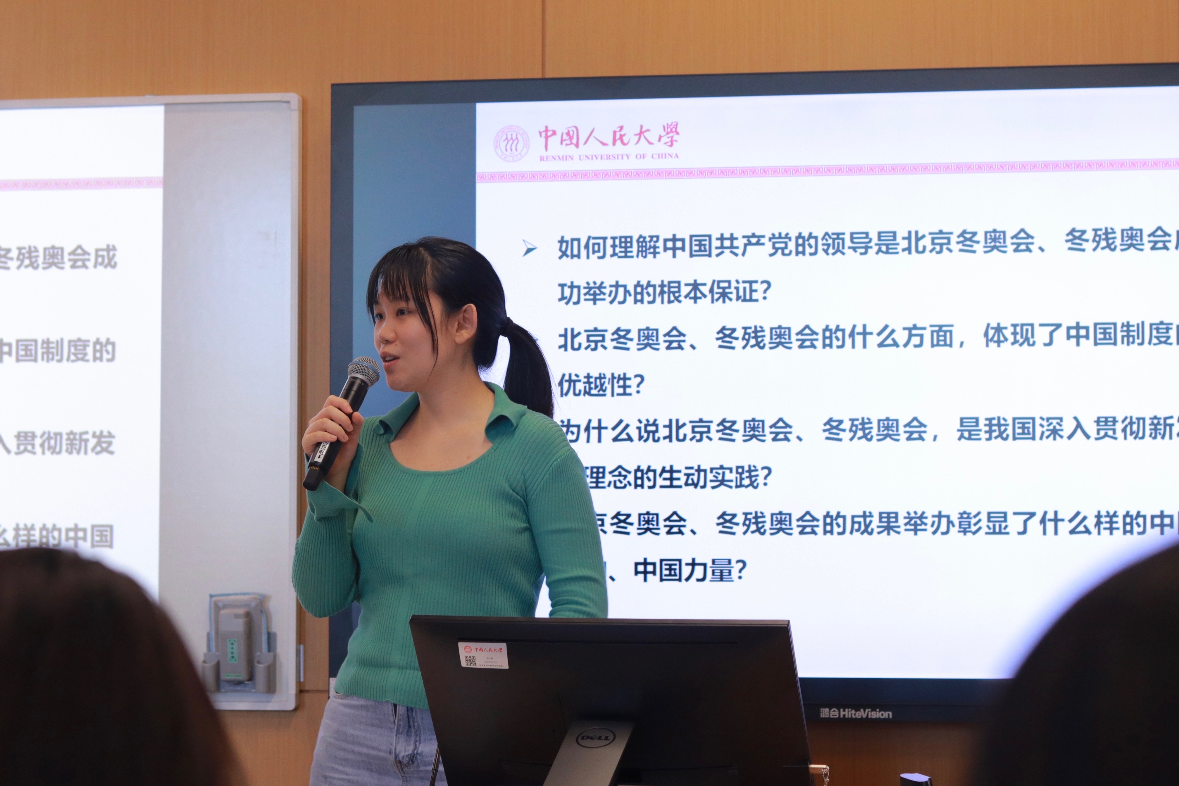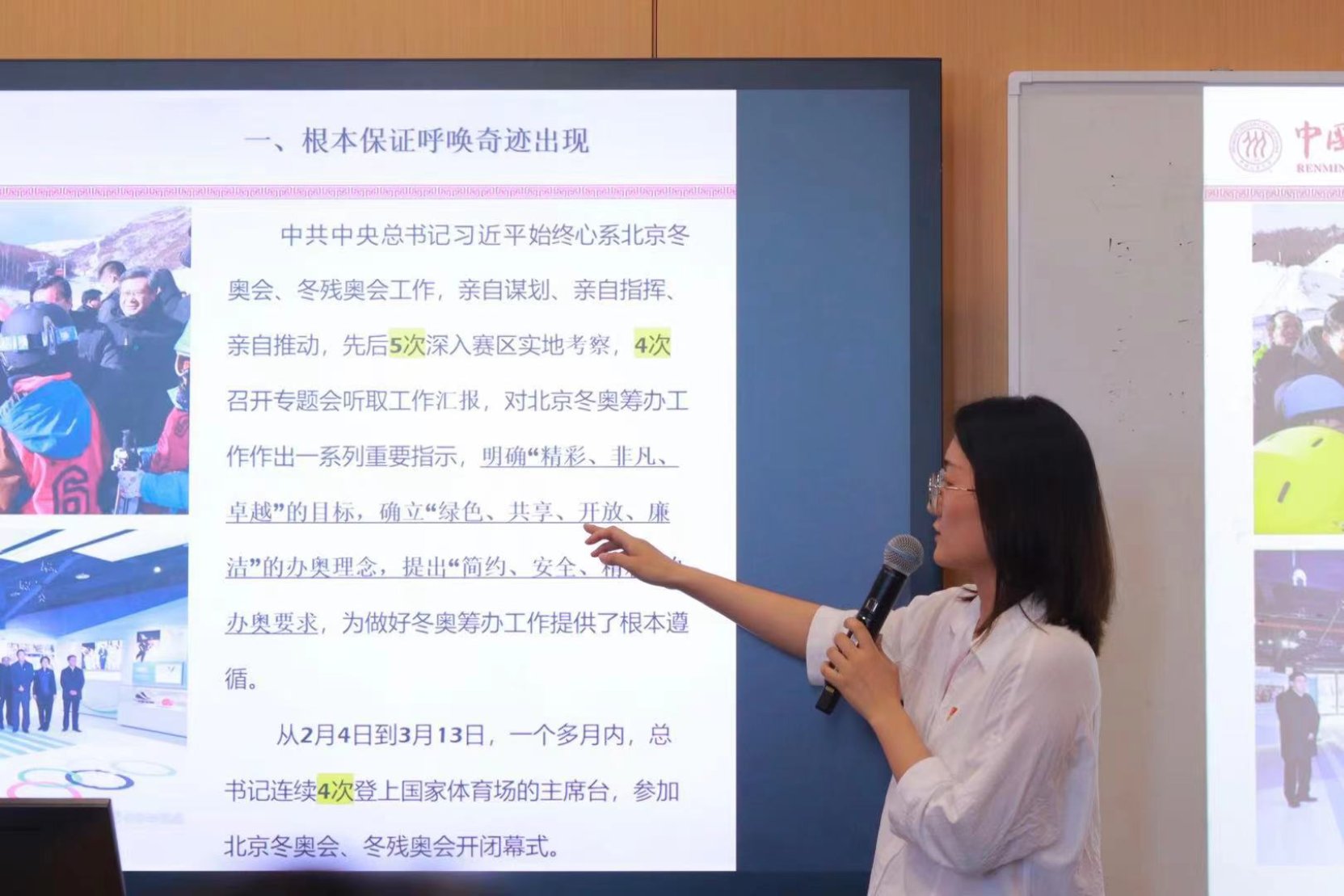 接着,来自经济公司的张丹蕾同学以“冰雪中的中国奇迹”为题展开了理论宣讲,回顾了北京冬奥会、冬残奥会的盛况,并从根本保证呼唤奇迹出现、制度合力化解种种难题、发展奇迹增强国家底气、中国精神供给强大动力四个方面讲述了冬奥会成功举办与中国特色社会主义建设之间的紧密契合,详细论述了“五个必由之路”在冬奥会中的具体体现,重点阐释了“胸怀大局、自信开放、迎难而上、追求卓越、共创未来”冬奥精神的深刻内涵。宣讲内容详实,讲述深入浅出,现场学习气氛浓厚。