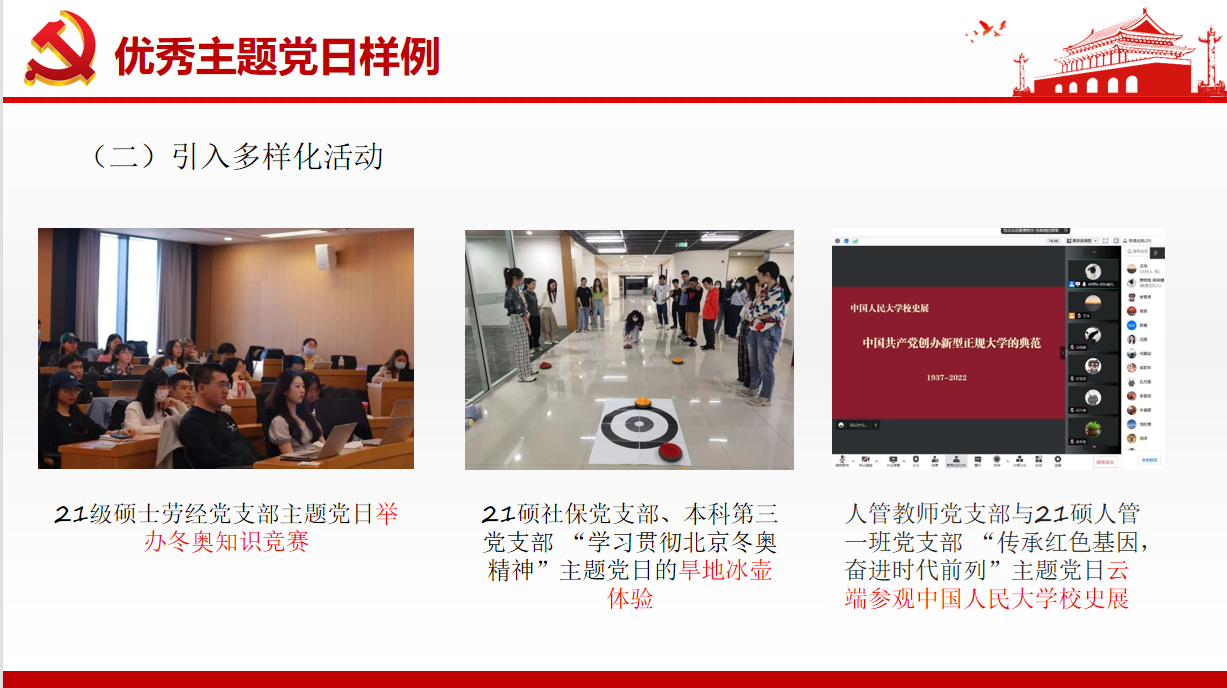 陈佳雪开宗明义,从主题党日的历史讲起。从1936年“党日”雏形产生,到2006年开始引入“主题”这一概念,主题党日经历八十多年发展历程,2018年《中国共产党支部工作条例(试行)》明确规定了主题党日开展的基本要求。随后,陈佳雪从主题党日开展前的准备、开展中的基本程序、开展后的记录规范三方面对主题党日的要求进行了讲解,强调了开展前要“明确主题、明确人员、明确时间”,开展中要遵循基本程序,开展后要及时按规定进行记录、保留材料。最后,申莹从组织支部间联学、引入多样化活动和实地体验深度学习三方面为大家提供了一些优秀主题党日样例。