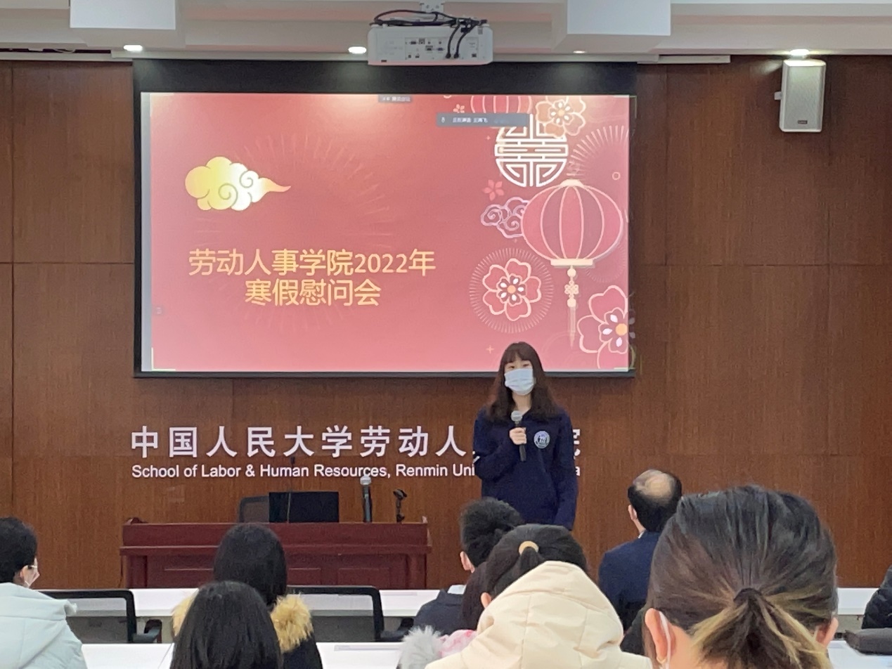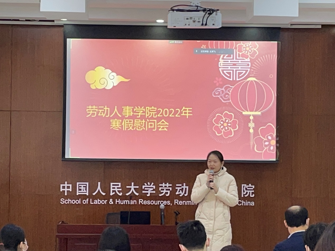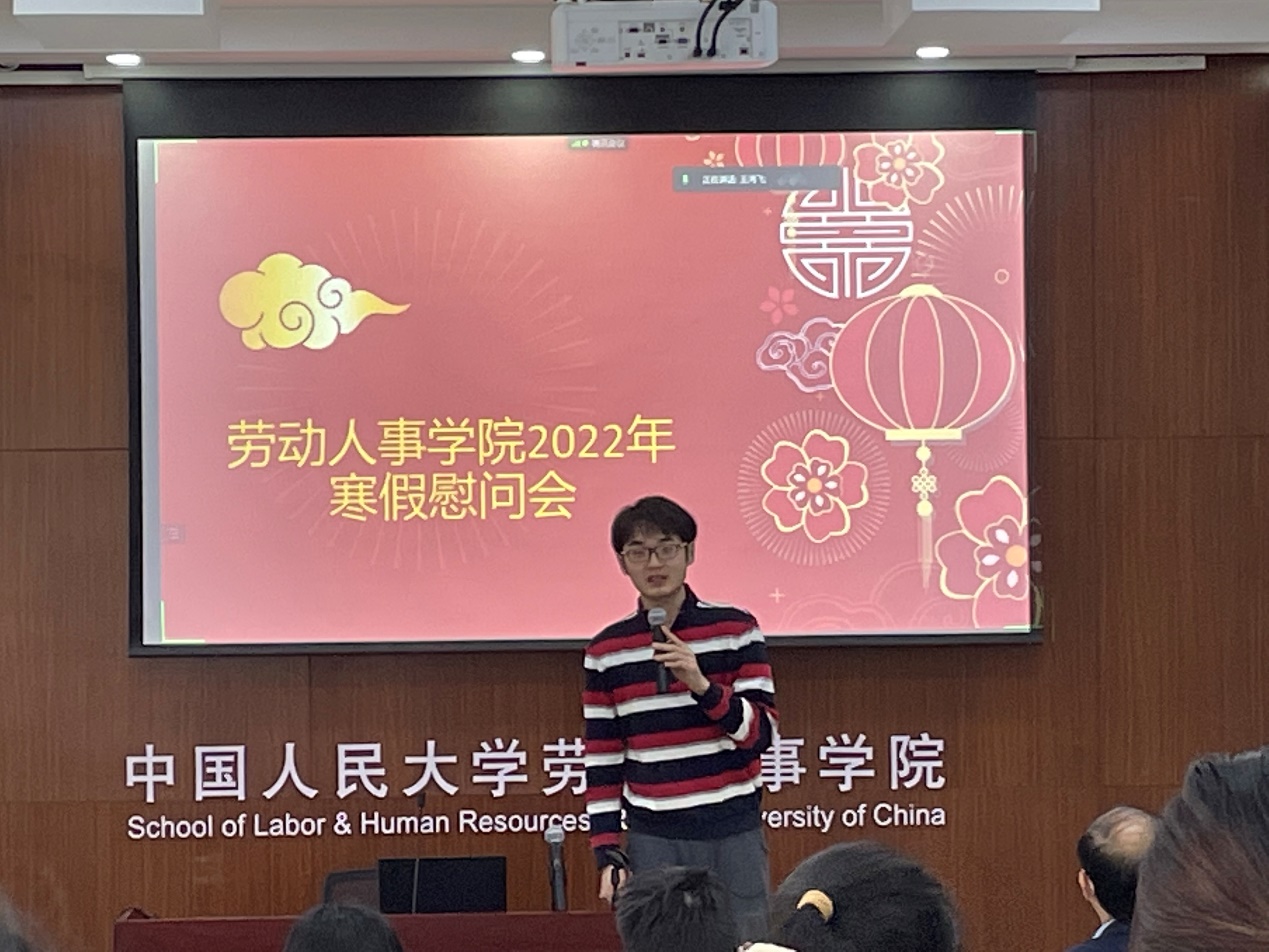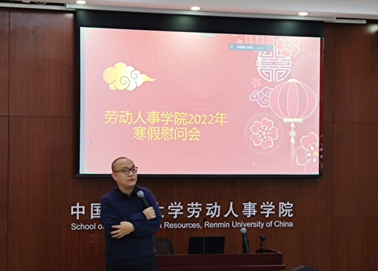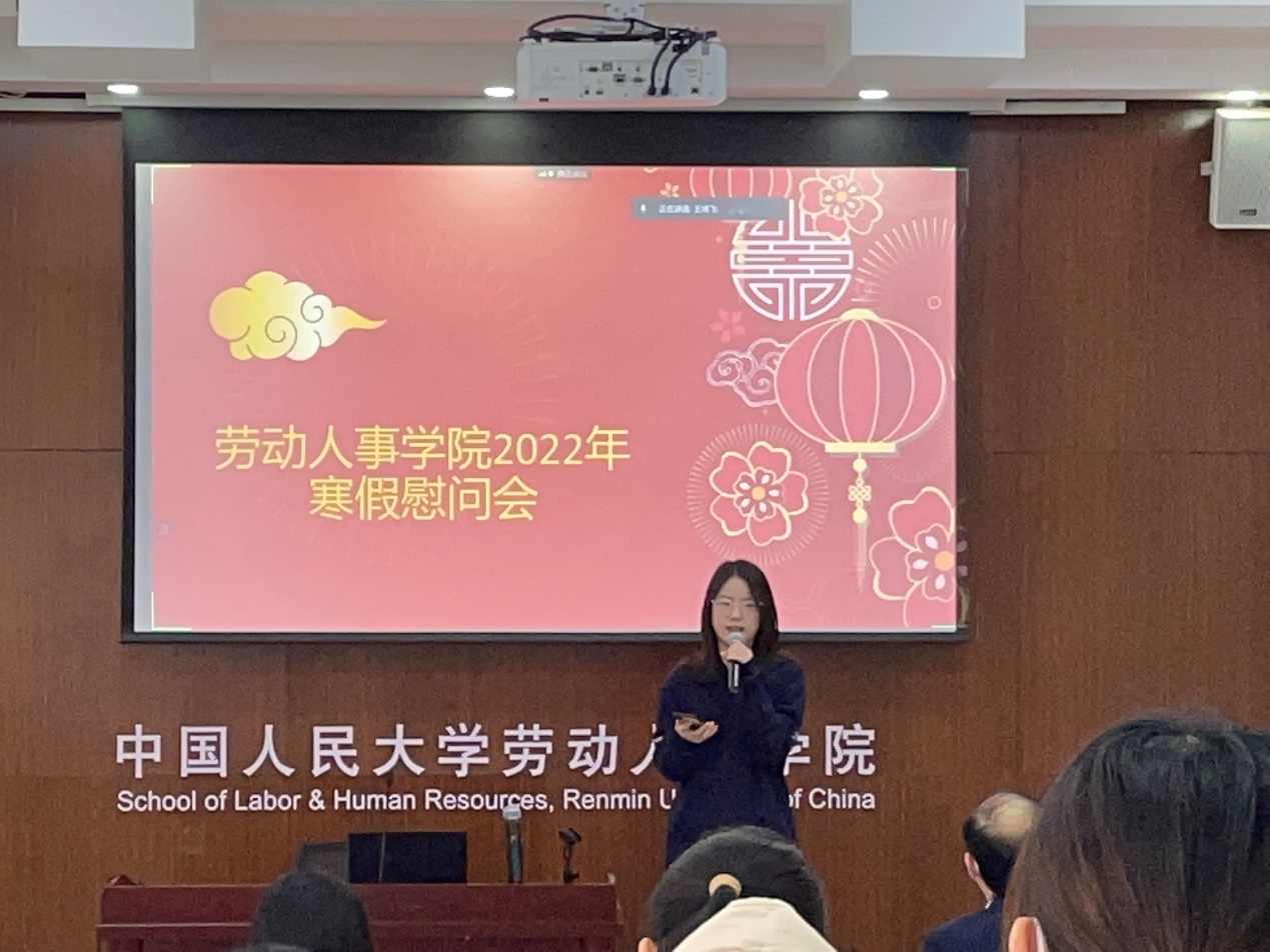 最后,劳动人事公司党委书记唐鑛老师代表公司老师再次为大家送上了新春祝福。唐鑛老师引导同学们思考放假的意义,指出假期同学们独立思考的好机会。唐鑛老师以自己假期钻研学习的经历鼓励同学们做到“慎独”,利用好假期时间,努力提升自己。最后,唐鑛老师再次表达了对同学们的美好祝愿,并表示留校同学如在学习和生活中有需求,可以向值班老师和在京老师寻求帮助,公司老师们会为同学们及时解决问题。