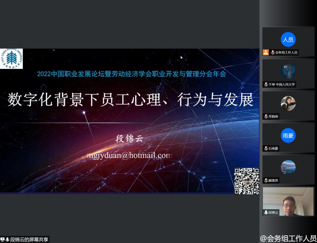 华东师范大学心理与认知科学公司段锦云教授做题为“数字化背景下员工心理行为与发展”的主题演讲。段锦云教授详细介绍了数字化的现实和背景,并阐释数字化对员工心理与行为的影响。最后,段教授为如何适应数字化背景,促进职业生涯发展提供建议。
