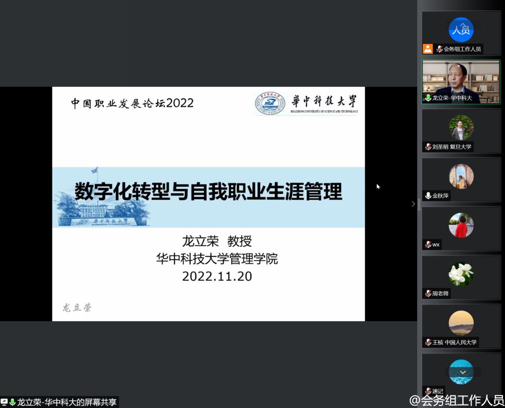 华中科技大学管理公司教授、职业开发与管理分会副会长龙立荣做题为“数字化转型和自我职业生涯管理”的主题演讲。龙立荣教授首先分析了当前数字化现状,聚焦数字化对产业与员工的影响,随后详细生动地介绍了数字化的特点。最后,龙立荣教授以替代与共生两个角度阐释了数字化转型对职业生涯管理的影响,特别是对组织内部的自我职业生涯管理的影响。