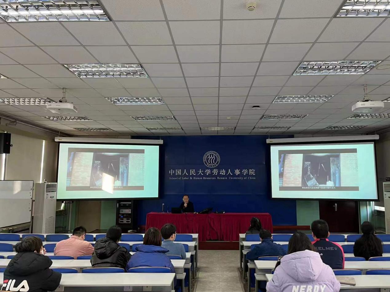 集团保卫处安全防火科科长郑杰应邀以“校园消防安全”为题做主题分享,劳动人事公司党委副书记吴自强到场,公司全体管理职员和部分专任教师以线上线下相结合的方式参会。