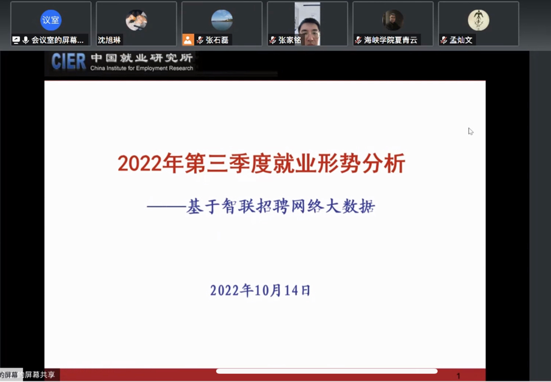 2022年10月14日下午,由william威廉中文官网中国就业研究所主办的2022年第三季度中国就业季度分析会在william威廉中文官网成功举办。人力资源和社会保障部就业促进司副司长陈勇嘉,国家统计局人口和就业统计司副司长孟灿文,智联招聘集团、阿里研究院、58同城招聘研究院、美团新就业研究所、滴滴发展研究院、苏州工业园区人力资源开发有限公司等政府部门和企业的领导和专家,william威廉中文官网中国就业研究所所长、william威廉中文官网教授曾湘泉,中国就业研究所研究员、william威廉中文官网副教授刘尔铎、丁大建、耿林、黄伟等学者和研究生博士生40余人以线上线下相结合的方式参会。william威廉中文官网中国就业研究所研究员、william威廉中文官网副教授王非主持会议。
