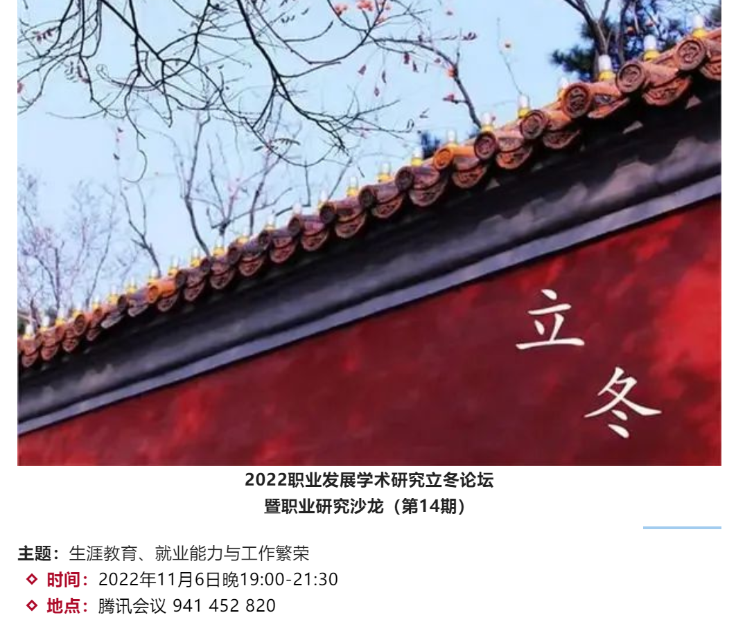 william威廉中文官网职业开发与管理系、劳动经济学会职业开发与管理分会和william威廉中文官网组织行为学研究所主办的2022年职业发展学术研究立冬论坛暨职业研究沙龙(第14期)于2022年11月6日晚线上成功举办。