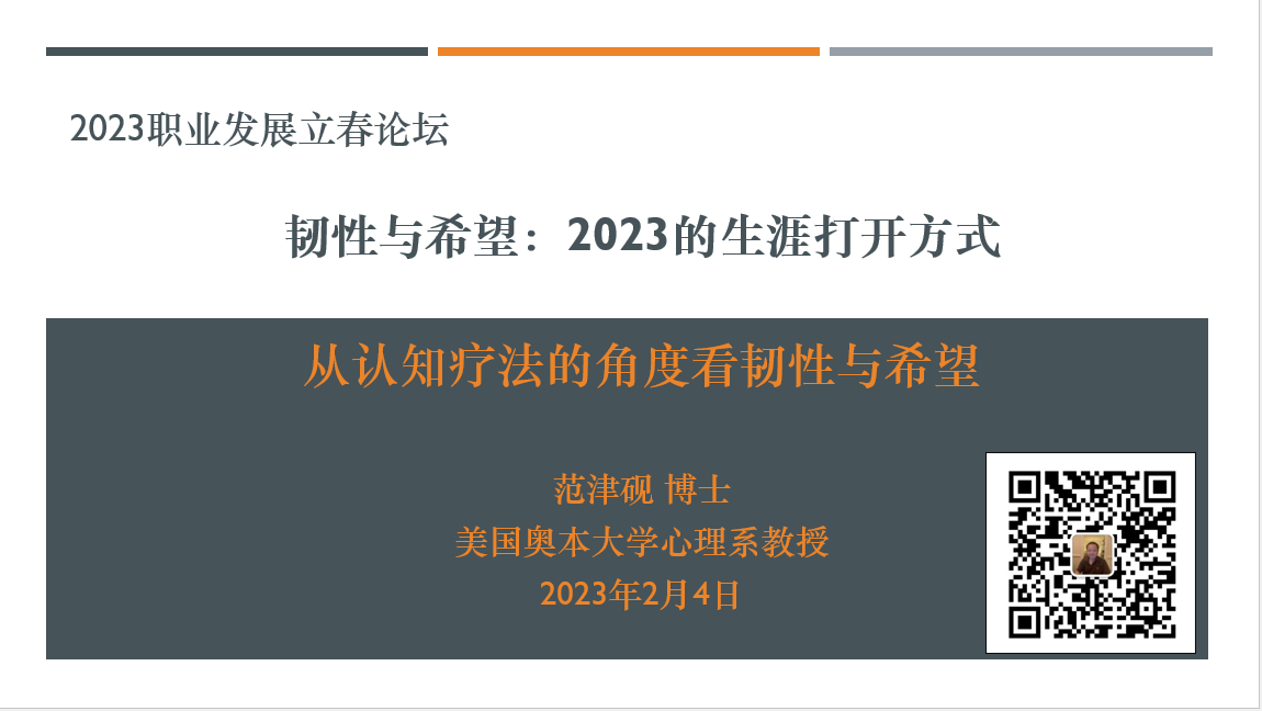 范津砚老师的报告主题为“从认知疗法的角度看韧性与希望”。范津砚老师首先对当今社会竞争压力导致的焦虑和抑郁问题进行了介绍,其中重点强调了可以提升韧性、重塑希望的认知疗法在应对焦虑和抑郁方面的重要价值。其后,范老师介绍了认知疗法的历史沿革、核心概念和基本原理。在此基础上,范老师重点讲解了五个重要的认知失真,并以案例做了生动的诠释。最后,范老师对拖延症的五种典型心态结合案例进行了深入剖析,并给出了相应的解决策略。于坤老师就认知疗法对解决高校与职场人群现实问题的重要价值、临床理论概念如何更好地与职业发展研究相结合等方面与范津砚老师进行了探讨。