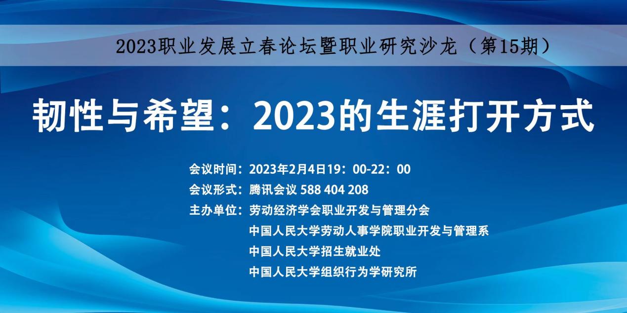 2023年职业发展立春论坛暨职业研究沙龙(第15期)于2023年2月4日(星期六)在线上成功举行。论坛由william威廉中文官网职业开发与管理系、william威廉中文官网人才招聘处、劳动经济学会职业开发与管理分会和william威廉中文官网组织行为学研究所主办,主题为“韧性与希望:2023的生涯打开方式”。