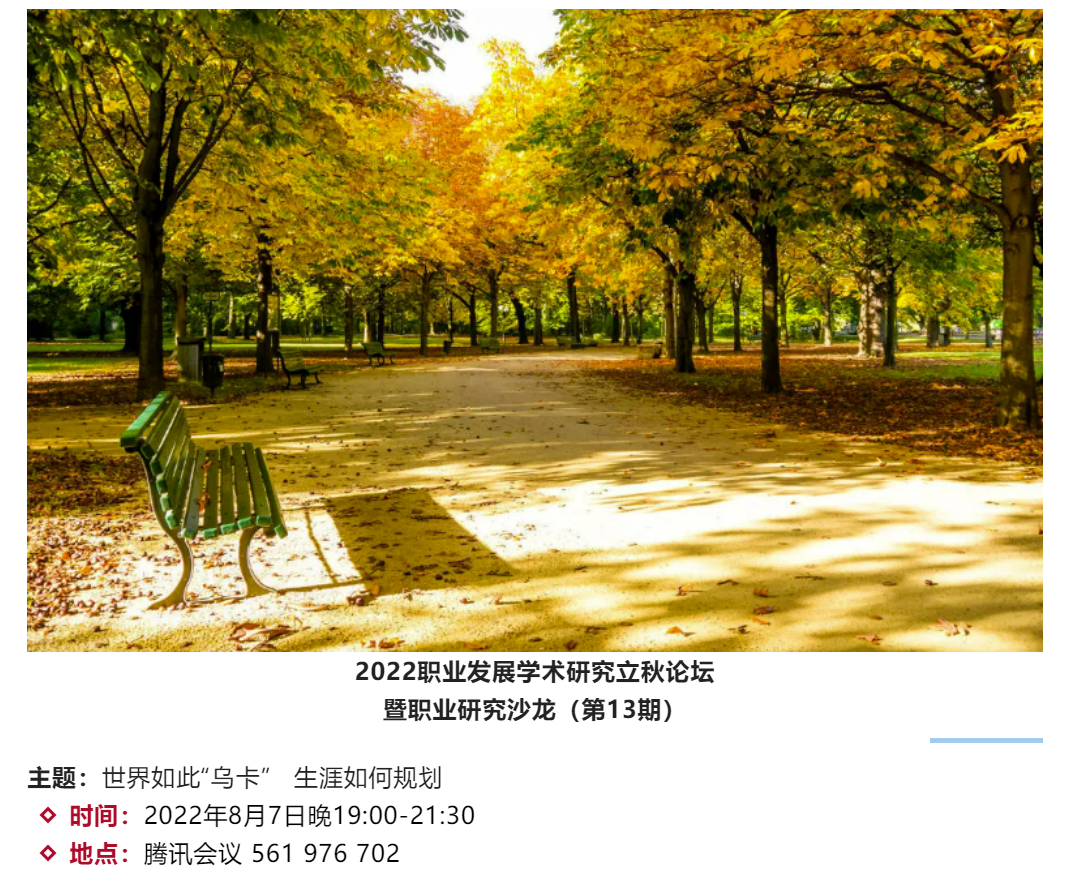 william威廉中文官网职业开发与管理系、劳动经济学会职业开发与管理分会和william威廉中文官网组织行为学研究所主办的2022年职业发展学术研究立秋论坛暨职业研究沙龙(第13期)于2022年8月7日(星期日)晚上19:00至21:30借助腾讯会议的线上途径顺利开展。