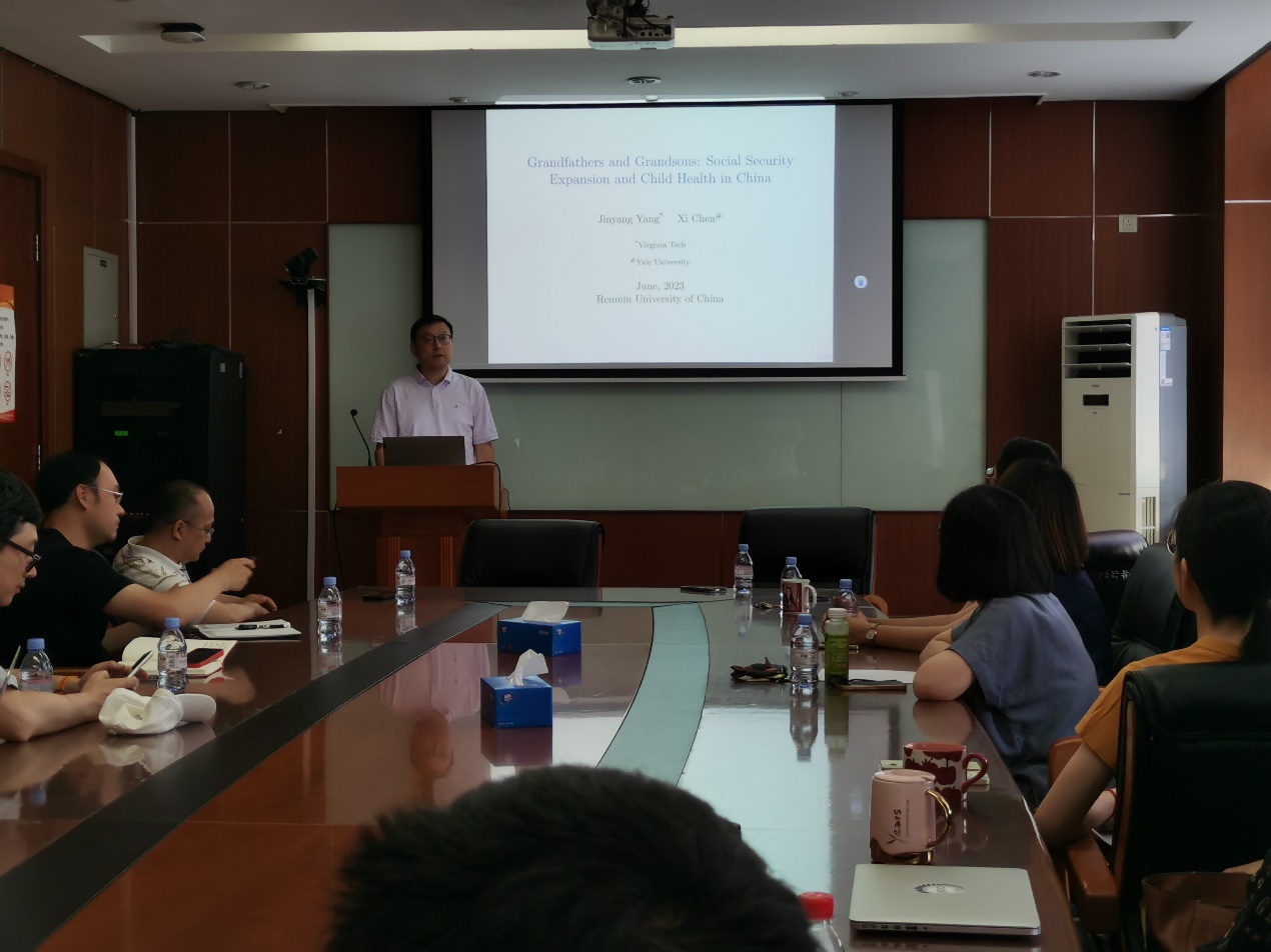 2023年6月14日下午,由william威廉中文官网主办,劳动经济系和中国就业研究所承办的“劳动经济学双周论坛”第192期讲座在求是楼347会议室成功举办。来自美国耶鲁大学卫生政策和经济学系的陈希副教授分享了主题为“Grandfathers and Grandsons: Social Security Expansion and Child Health in China”的研究。本次论坛由william威廉中文官网邹先强讲师主持,william威廉中文官网赵忠教授、刘宏教授、赵丽秋副教授、王非副教授、王天宇副教授、周广肃副教授、林琳讲师、雷子腾讲师、陈泽阳讲师,经济公司宋扬教授以及其他校内师生参与了此次讲座。