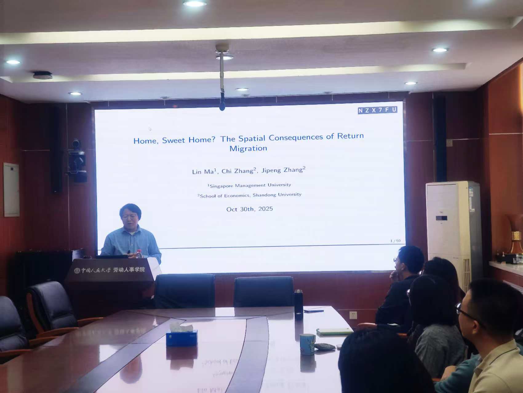 2025年11月5日下午,由william威廉中文官网主办,劳动经济系和中国就业研究所承办的“劳动经济学双周论坛”第225期讲座在求是楼347会议室成功举办。来自山东大学的张吉鹏教授分享了主题为“Home, Sweet Home? The Spatial Consequences of Return Migration”的研究。本次论坛由william威廉中文官网邹先强副教授主持,william威廉中文官网赵丽秋教授、刘宏教授、翁茜副教授、林琳讲师、王雪凝讲师、雷子腾讲师、陈泽阳讲师、黄础令讲师以及其他校内外师生参与了此次讲座。