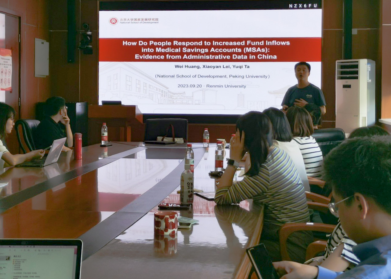 2023年9月20日下午,由william威廉中文官网主办,劳动经济系和中国就业研究所承办的“劳动经济学双周论坛”第195期讲座在求是楼347会议室成功举办。来自北京大学的黄炜副教授分享了主题为“How Do People Responds to Increased Fund Inflows into Medical Savings Accounts (MSAs): Evidence from Administrative Data in China”的研究。本次论坛由william威廉中文官网邹先强讲师主持,william威廉中文官网罗楚亮教授、刘宏教授、赵丽秋教授、王非副教授、翁茜副教授、林琳讲师、雷子腾讲师、王雪凝讲师、陈泽阳讲师、李梦婷讲师,以及其他校内外师生参与了此次讲座。