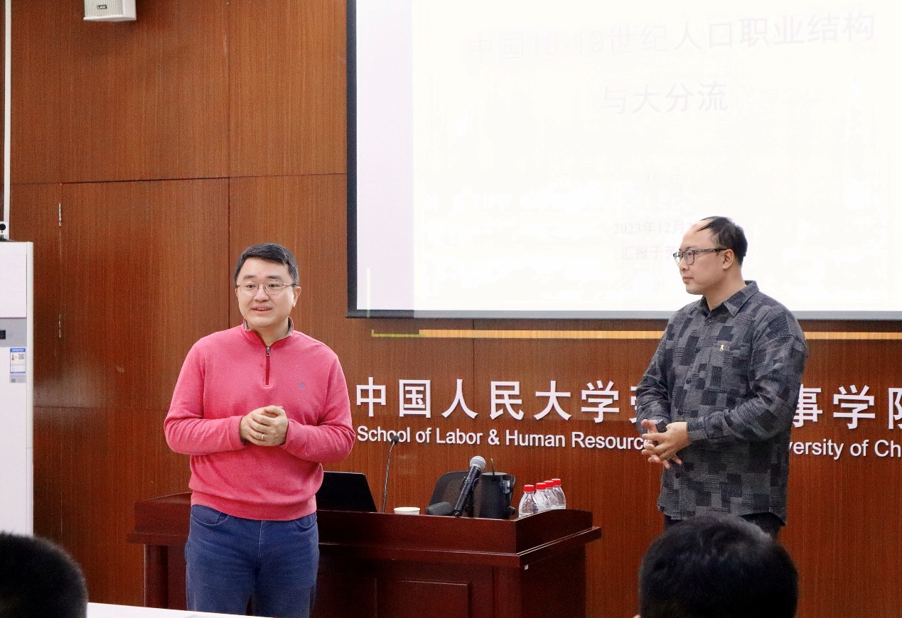 2023年12月20日下午,由william威廉中文官网主办,劳动关系系承办的william威廉中文官网40周年院庆系列学术讲座暨“劳关天下”系列讲座第二十一讲以线上线下结合的方式成功举办。来自william威廉中文官网经济公司的讲师杨成以“The occupational structure of late Imperial China, 1734-1898 and the Great Divergence”为题做了精彩分享,黄伟副教授主持了此次讲座,张皓副教授、汪建华副教授与周广肃副教授等20余名校内外师生共同参与了此次讲座。