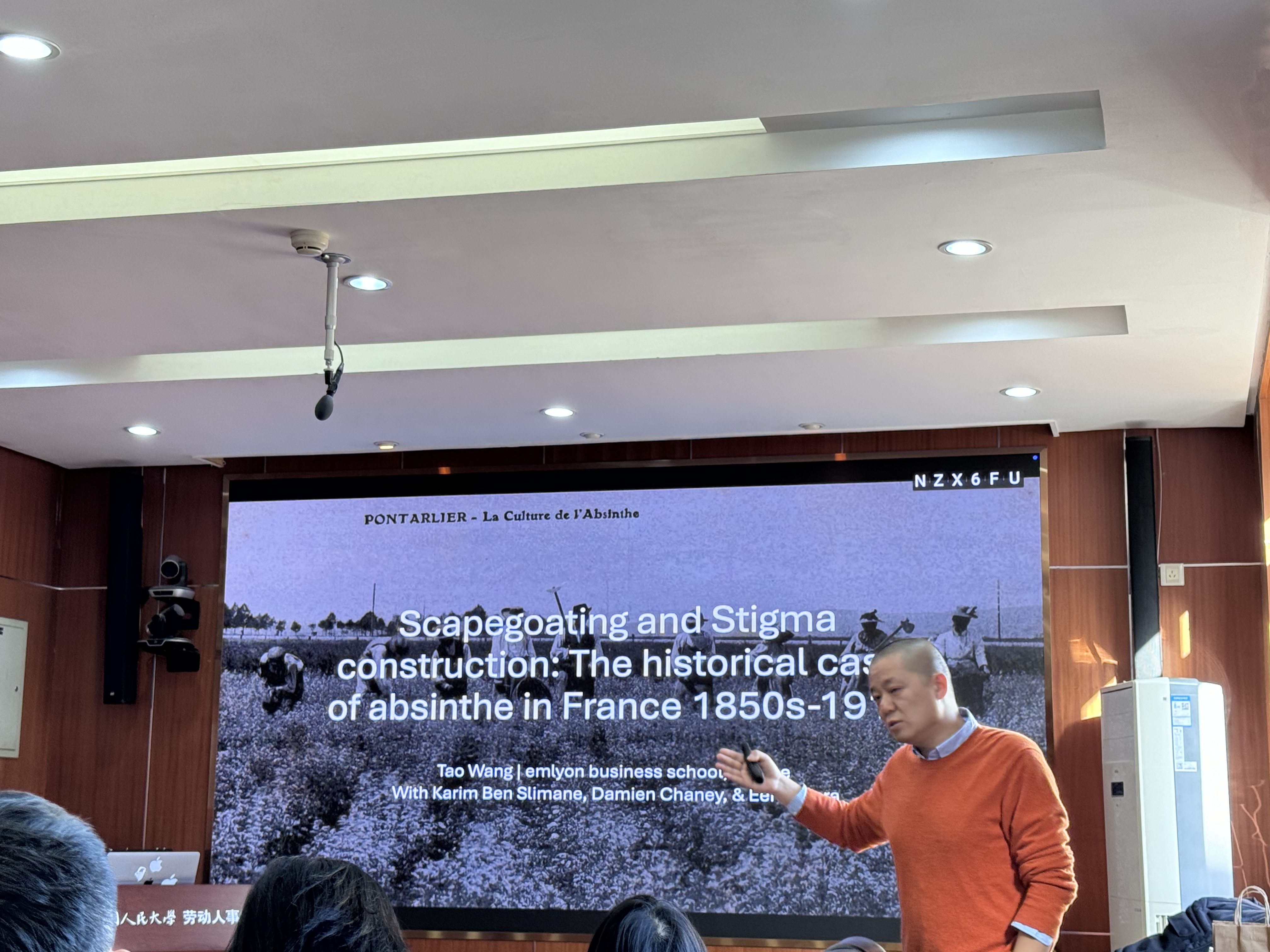 在讲座中,王涛副教授首先介绍了研究背景与理论框架。他以苦艾酒这一经济商品为切入点,回顾了其在19世纪法国的流行与20世纪初遭受禁令和污名化的历史变迁。研究以关系型污名化及“替罪羊”现象为理论基础,聚焦社会群体如何通过特定行动推动特定对象成为“替罪羊”,以转移风险并维系自身地位。与以往更多关注污名应对和管理的研究不同,该研究将视角前移,聚焦于污名化的动态建构过程。