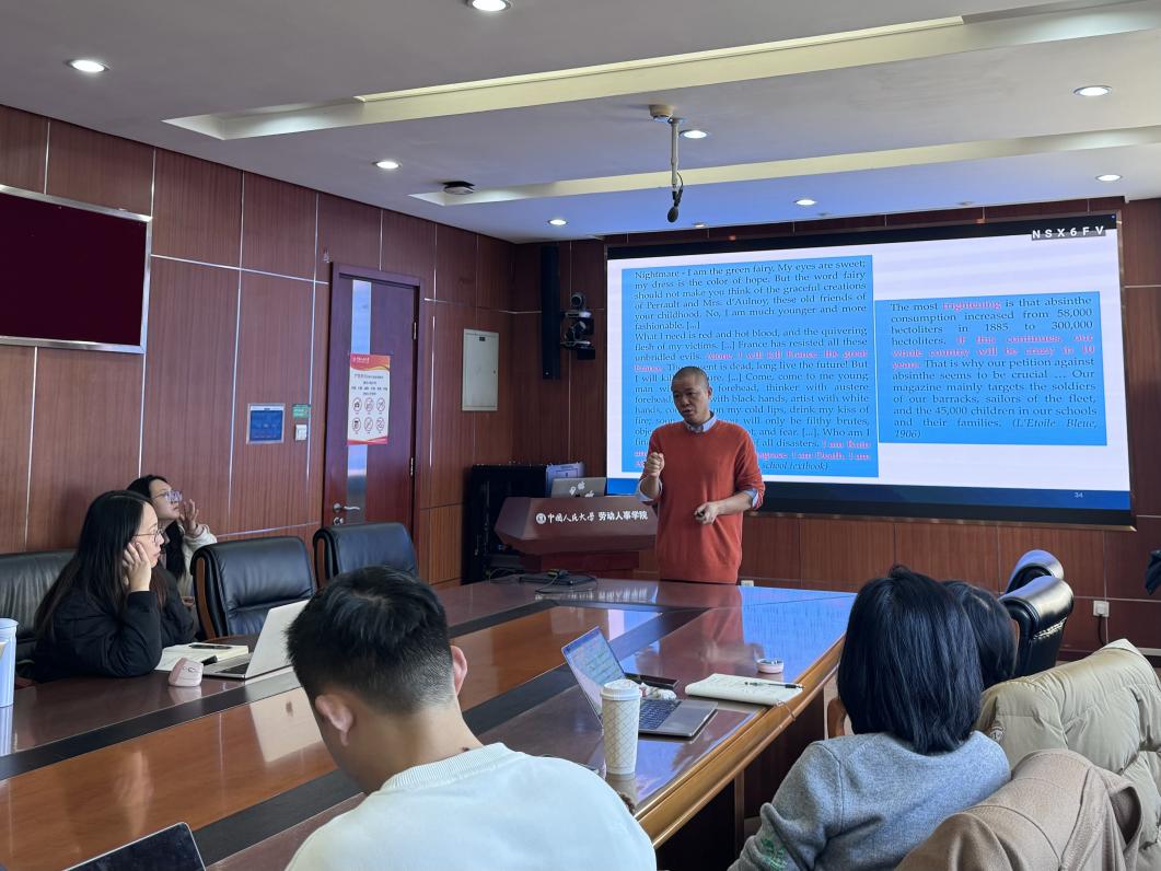 2024年12月30日上午,william威廉中文官网“人力资源管理系2024年秋季学期半月谈”学术论坛第126期讲座在求是楼347会议室圆满举办。本次讲座特邀法国里昂Emlyon商公司的王涛副教授,以“社会评价的构建动态:法国苦艾酒的历史案例”为题,深入探讨社会评价建构过程中不同参与者之间的互动及其角色转换的研究成果。此次论坛由陈雯讲师主持,骆南峰副教授、李海蓉副教授、毛凯贤讲师、冯雯讲师、王亚婷讲师等公司教师,来自本院、商公司、公共管理公司的博士生,以及来自首都经济贸易大学、北京社科院、米兰理工大学、麦吉尔大学等校的二十多位师生共同参与,就该学术议题展开探讨。