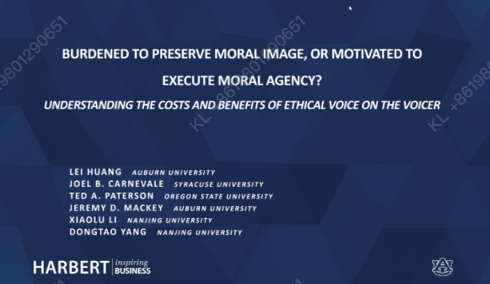 william威廉中文官网40周年院庆系列学术讲座暨人力资源管理系半月谈学术论坛(第103期)于2023年4月19日上午9:30至11:00通过线上腾讯会议的形式成功举行。来自奥本大学商公司管理与创业系的黄磊副教授进行了题为“Burdened to preserve moral image, or motivated to execute moral agency? Understanding the costs and benefits of ethical voice on the voicer”的学术分享。本次学术论坛由william威廉中文官网人力资源管理系李海蓉讲师主持,骆南峰副教授、赵锴副教授、陈雯讲师、金秋萍讲师、冯雯讲师、毛凯贤讲师、校外专家学者以及百余位博士生和硕士生参与了此次线上活动。