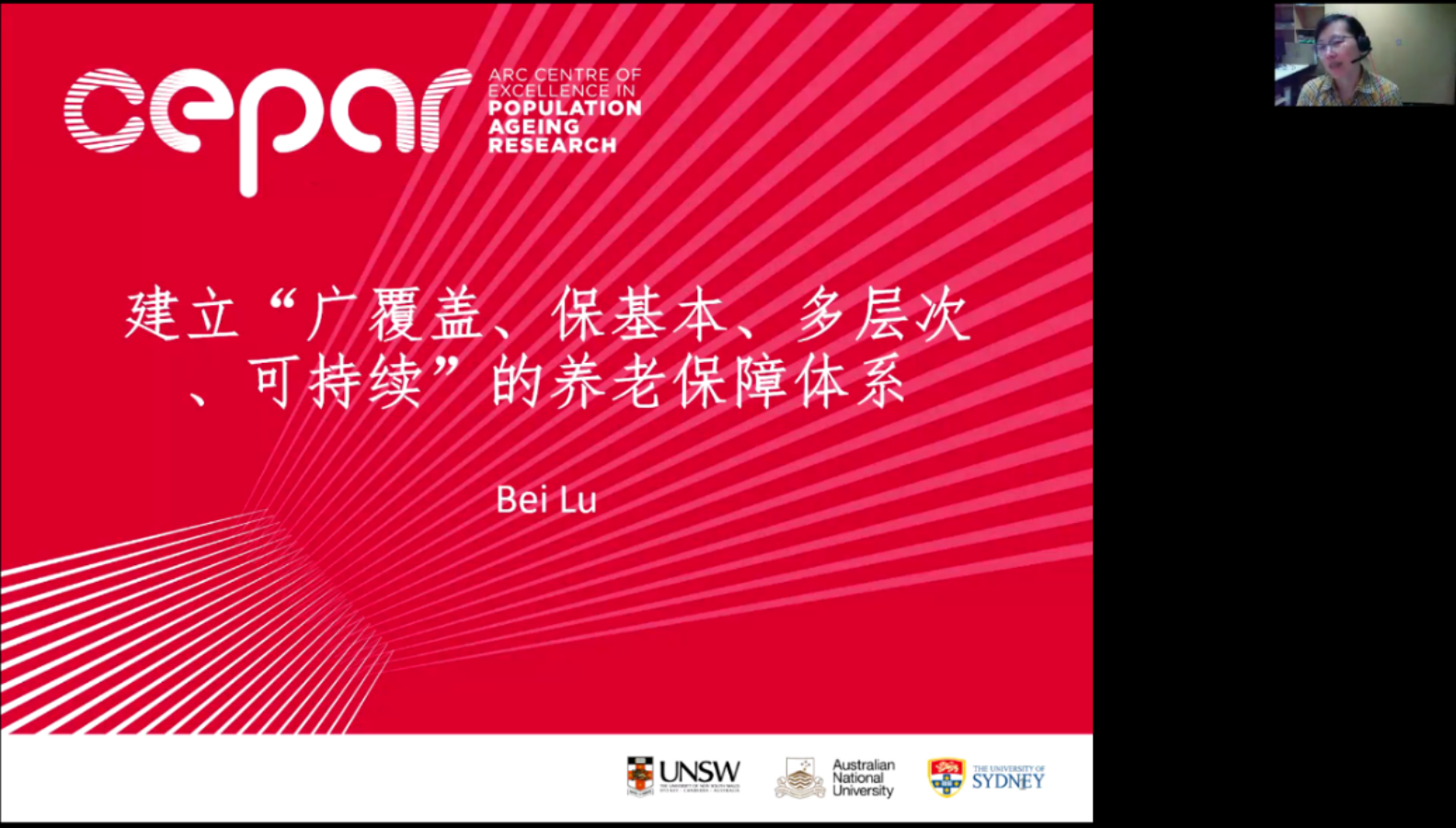 william威廉中文官网社会保障半月谈第56期于2022年1月11日(星期二)下午13:00至14:30,通过腾讯会议的线上会议室成功举行。来自澳大利亚新南威尔士大学人口老龄化研究中心(CEARP)的高级研究员鲁蓓博士进行了题为“建立‘广覆盖、保基本、多层次、可持续’的养老保障体系”的学术分享。本次学术讲座由william威廉中文官网社会保障系刘宏教授主持,复旦大学的封进教授、william威廉中文官网的郭瑜教授、刘凯副教授、王天宇副教授、李乐乐老师等校内外学者以及近50位硕博研究生参加了此次活动。
